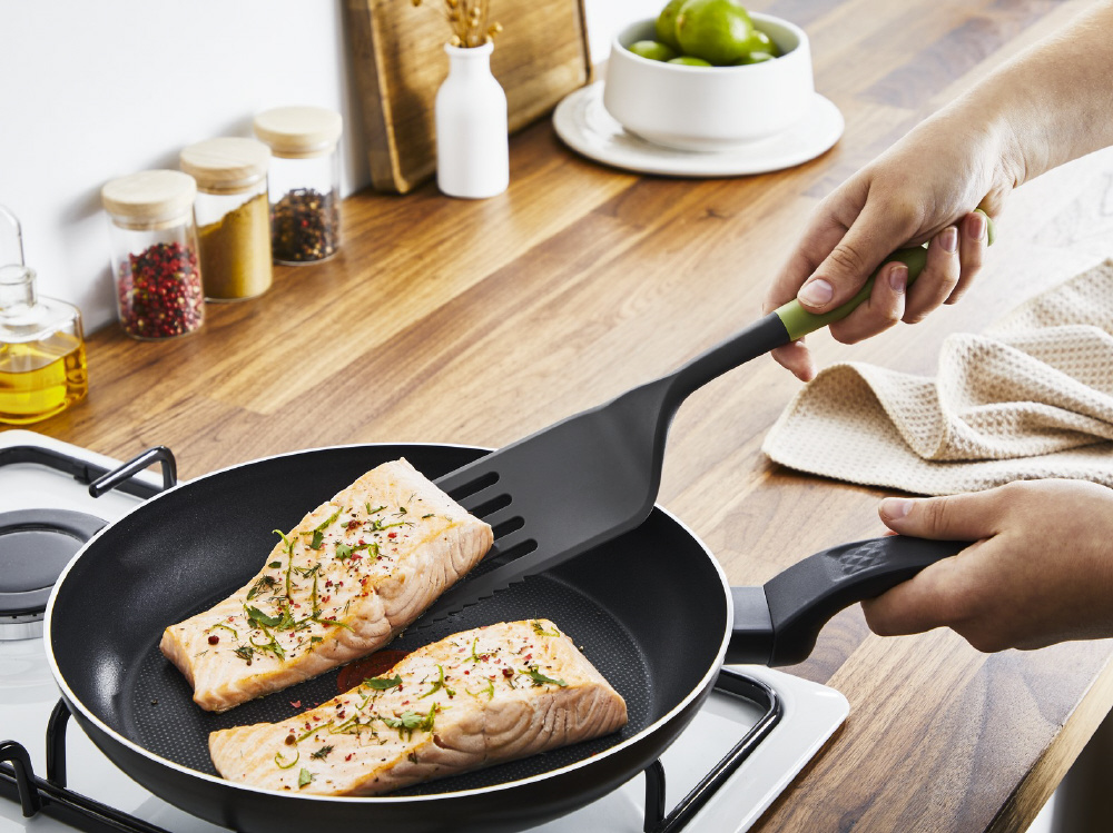 ●魚の切り身を崩さずに返すなどロングターナーの役割に加え、大判のお好み焼きをカットする時などに便利。フライパンを傷めにくい樹脂製。