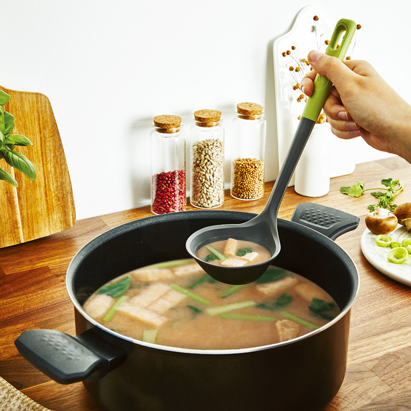 ●レードルとして汁物をすくうのはもちろん、内側に目盛りがついているので、料理しながら調味料を計量することができます。計量すぴーんを使わなくて済むので、洗い物も減らせます。