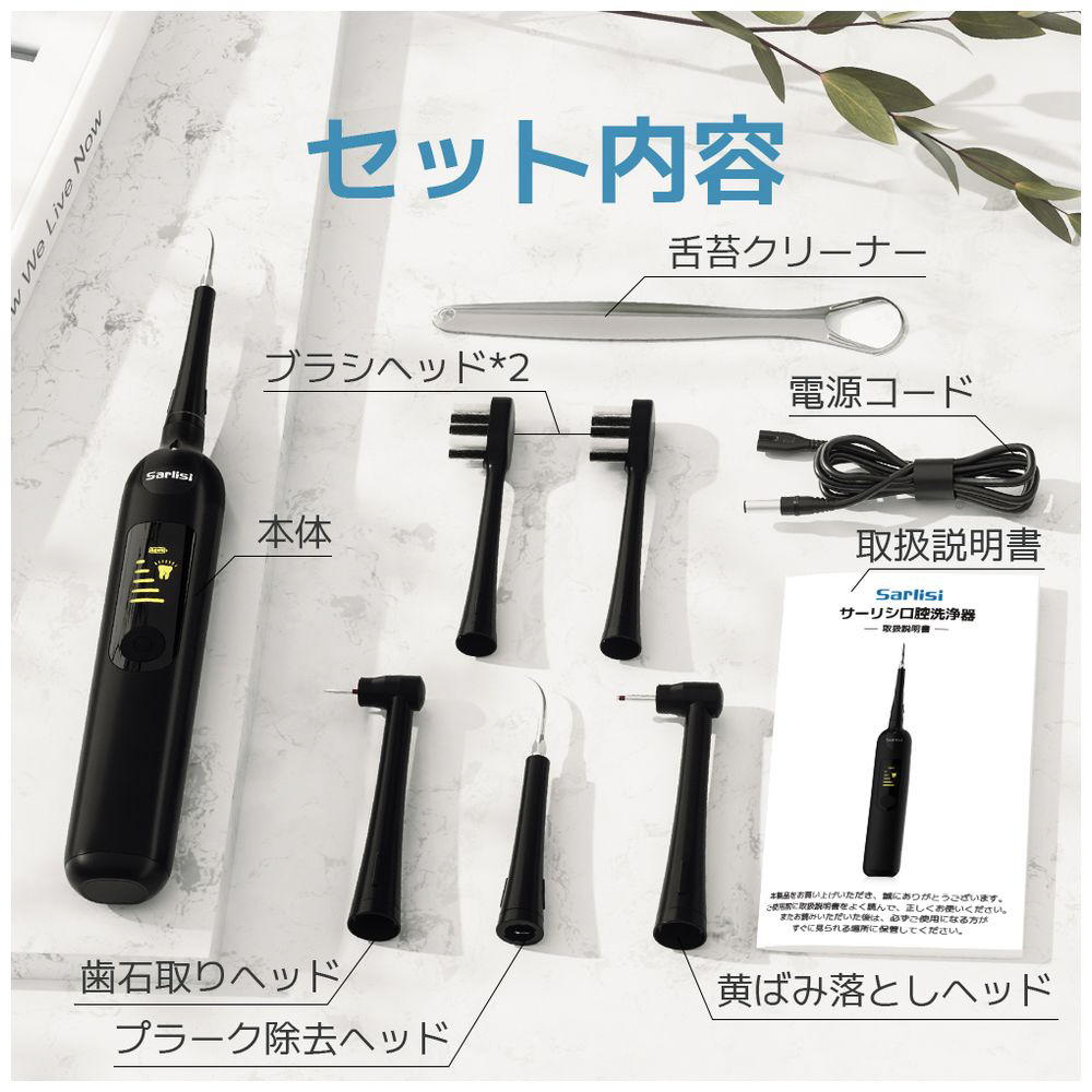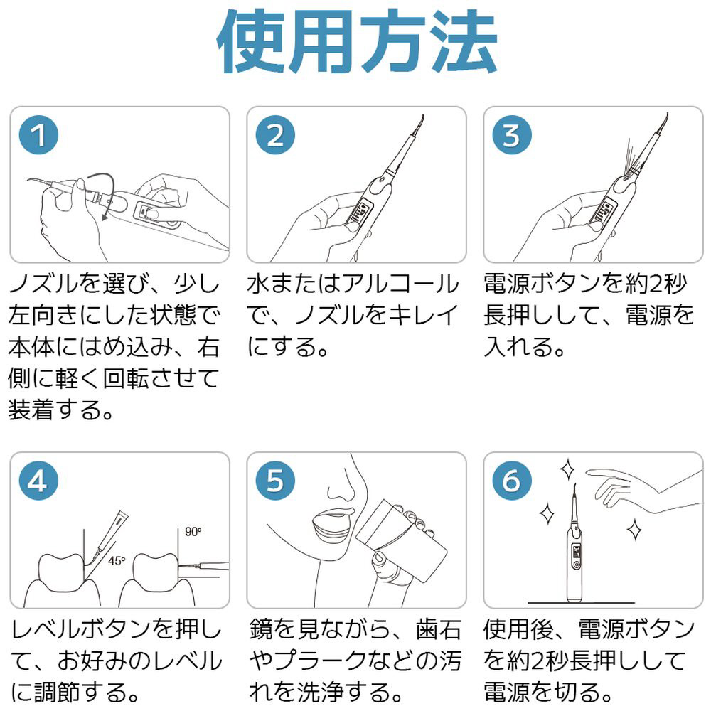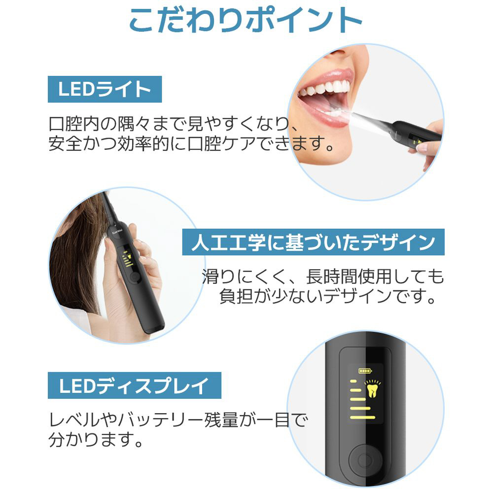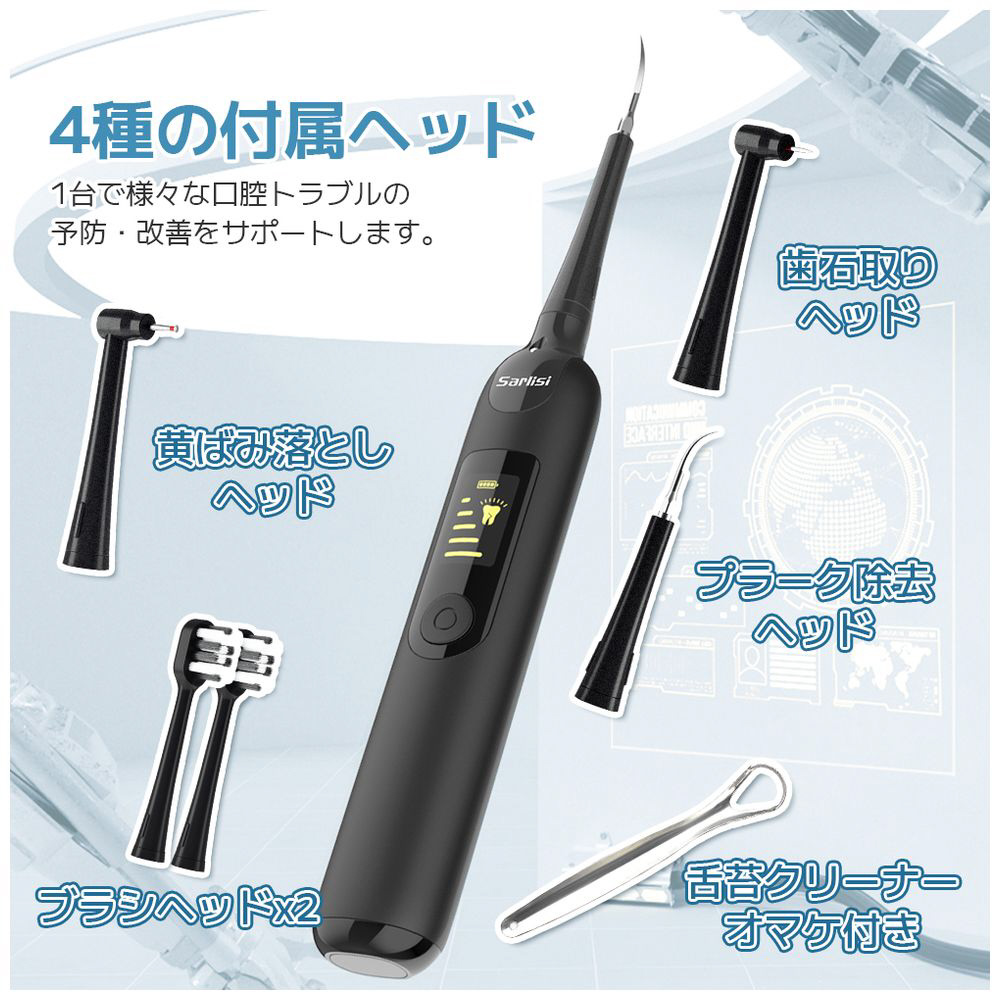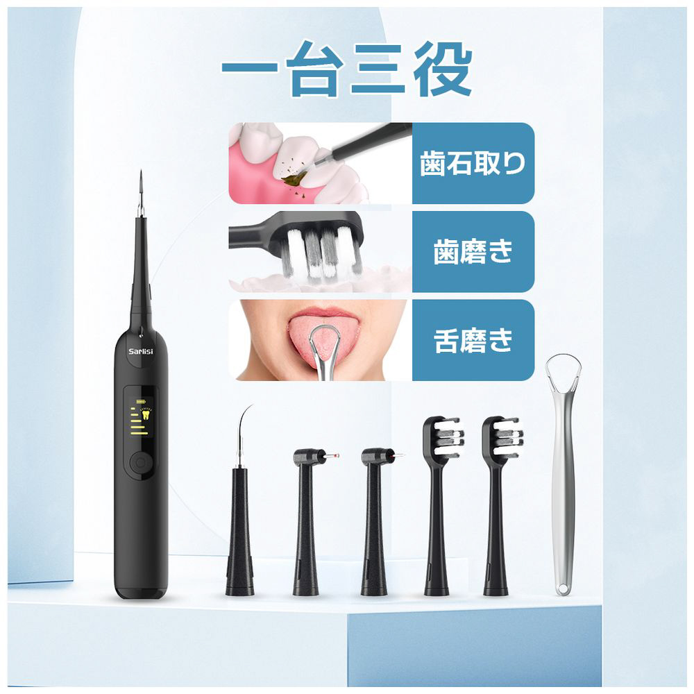 振動ブラシ(2個)、歯石除去ヘッド(3個)、舌クリーナー(1個)、状況に応じて使い分け、1台で家族みんなの口腔問題を改善できます。
