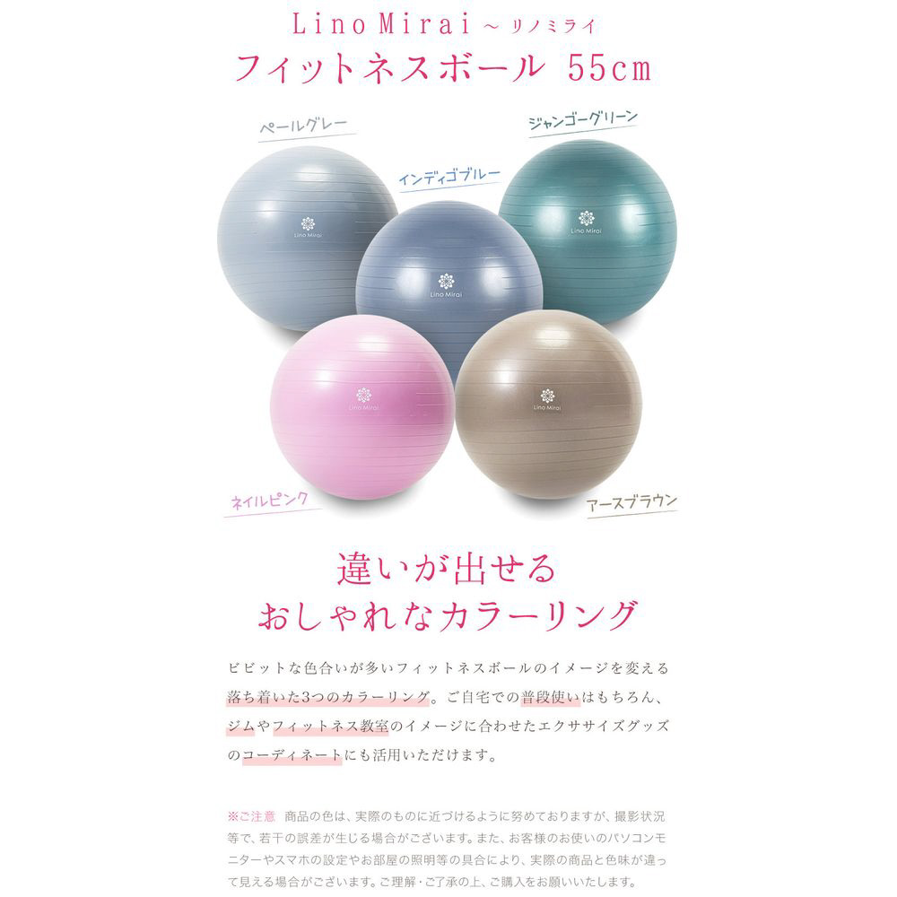 ビビットカラーが多いフィットネスボールのイメージを変える落ち着いた3つのカラーリング。ご自宅での普段使いはもちろん、ジムやフィットネス教室のイメージに合わせたエクササイズグッズのコーディネートにも活用いただけます。