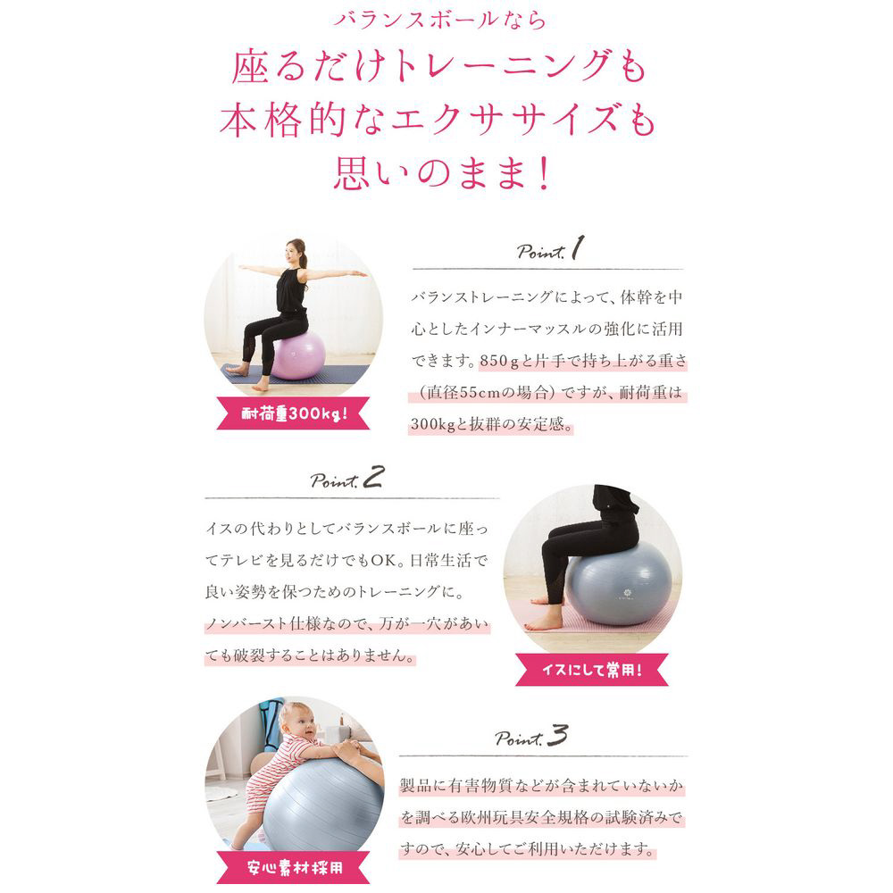 座るだけのトレーニングも本格的なエクササイズも思いのまま!さまざまなトレーニングにお使いいただけるバランスボールです。