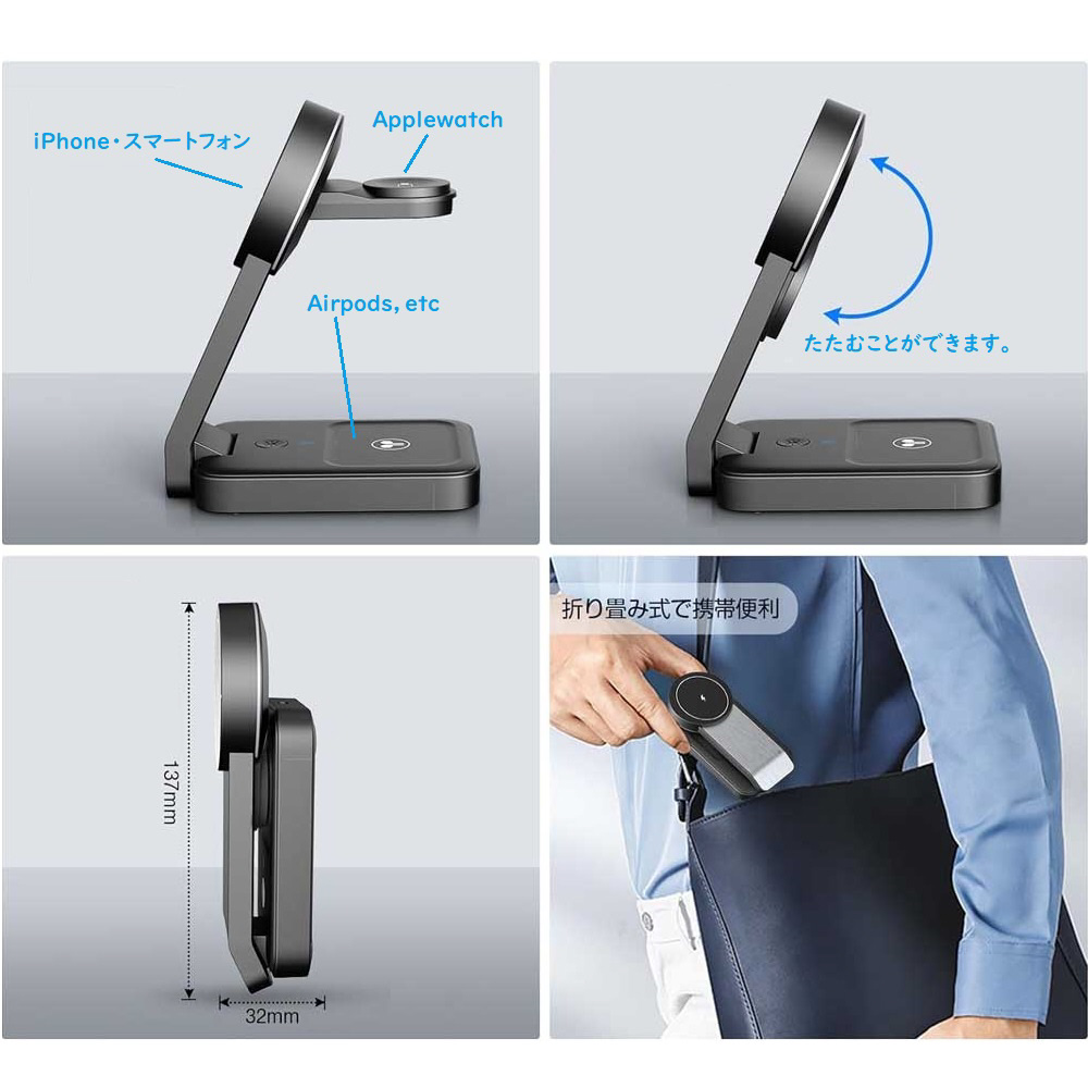コンパクトにたためる、スタイリッシュな3in1ワイヤレス充電器です。
