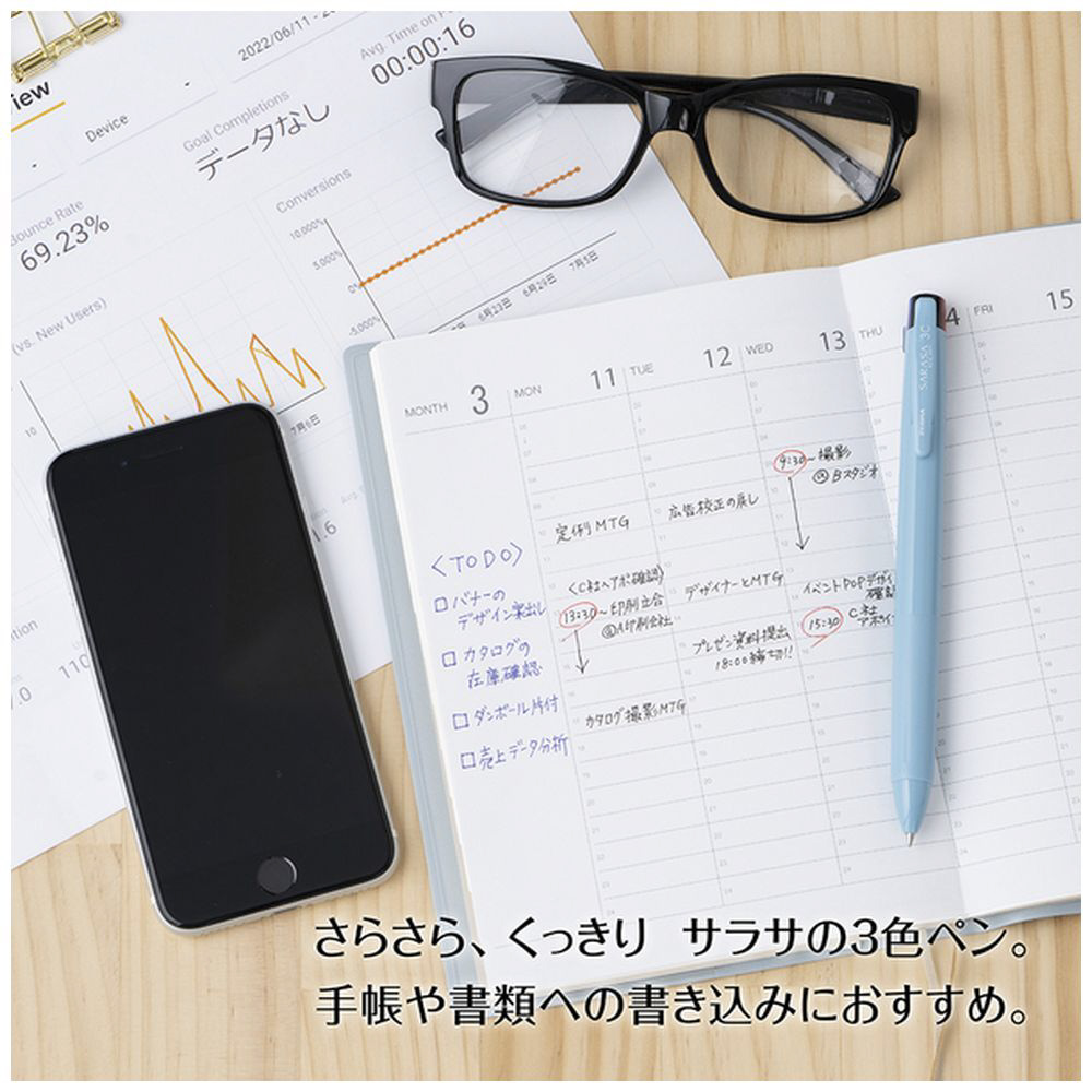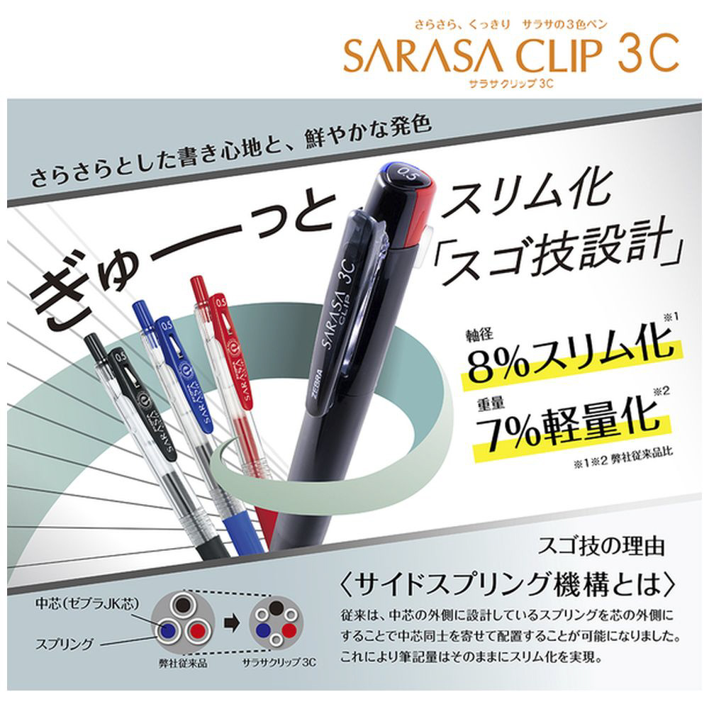 さらさらくっきり、きれいにまとまる。サラサクリップの3色ペン(ボール径0.4mm)
