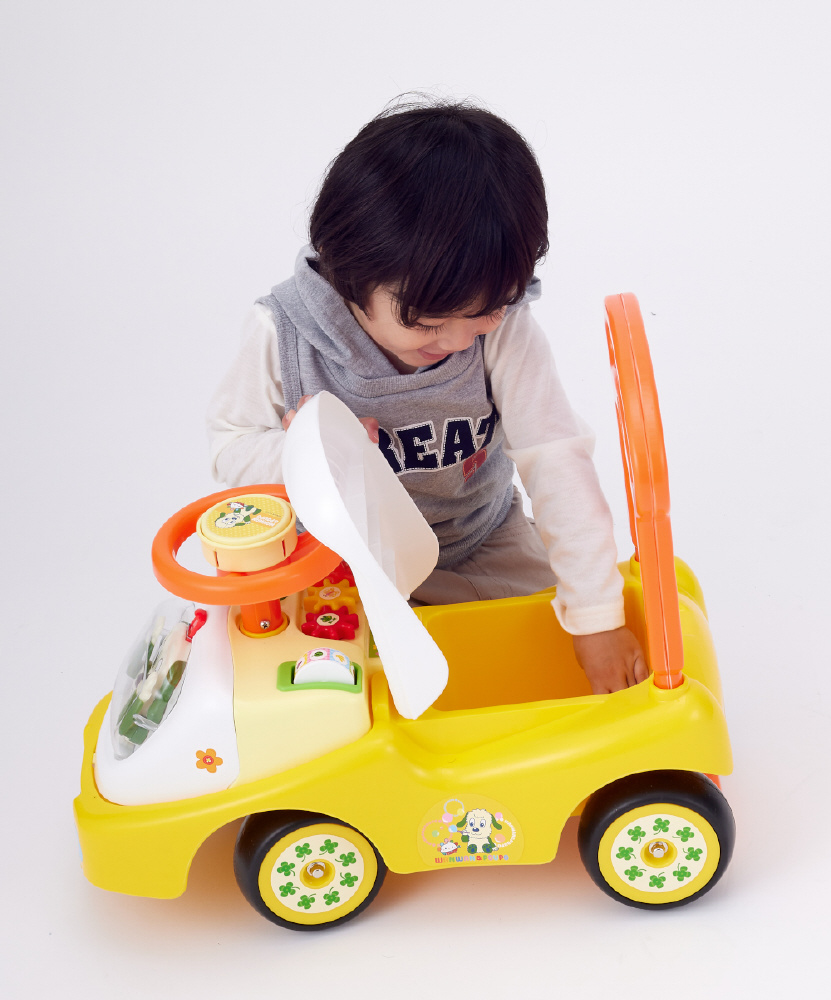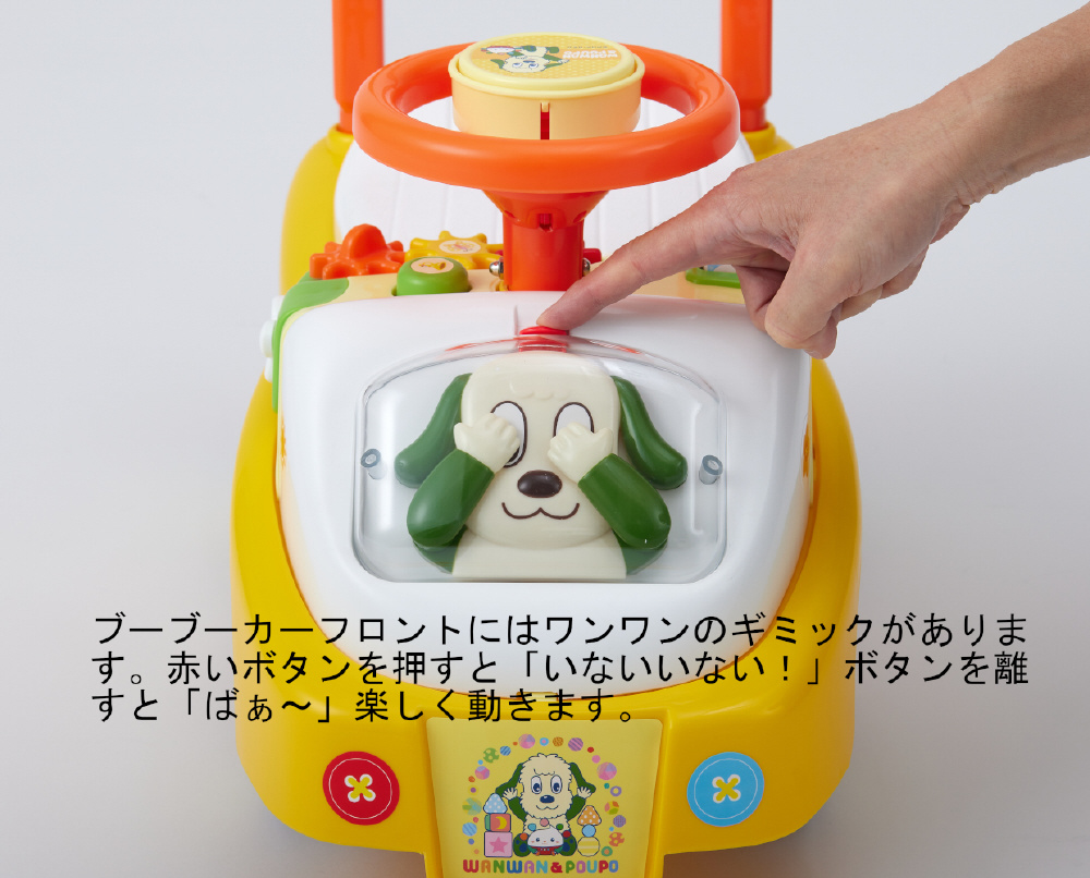 ●ブーブーカーフロントにはワンワンのギミックがあります。赤いボタンを押すと「いないいない!」ボタンを離すと「ばぁ〜」楽しく動きます。