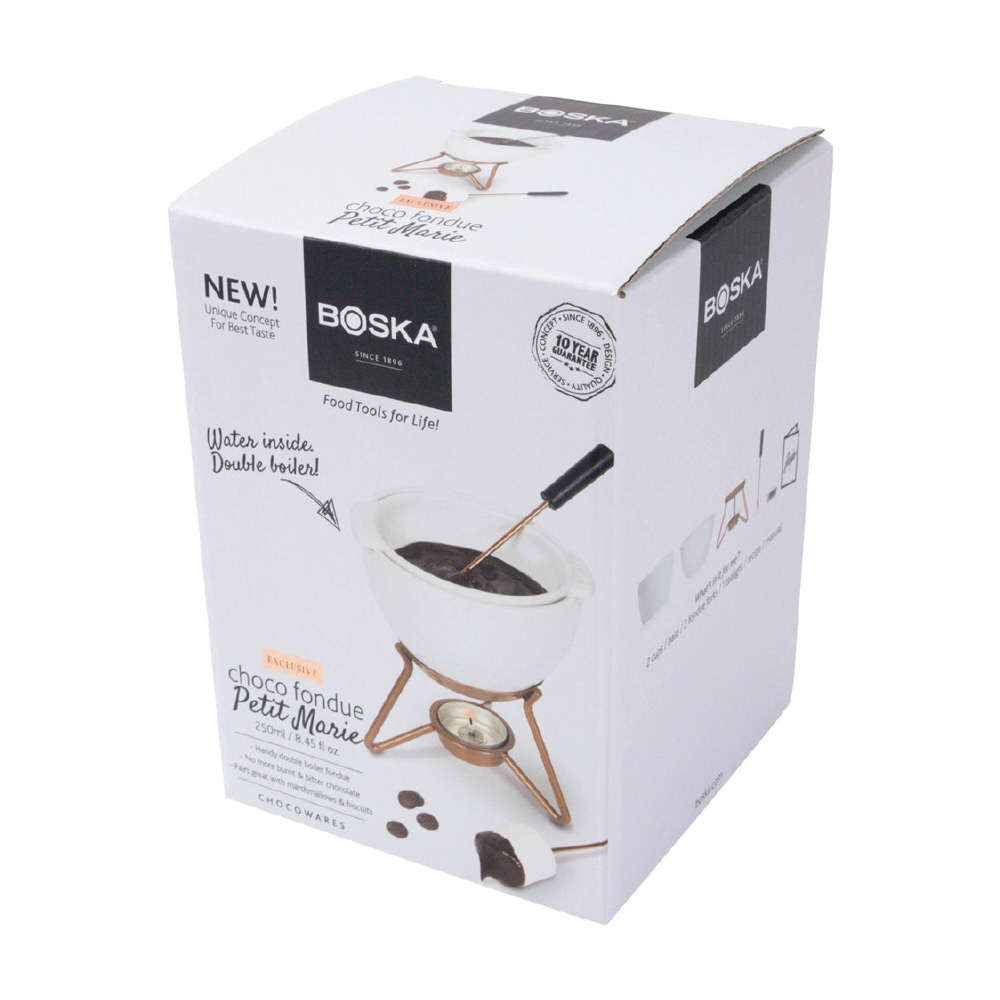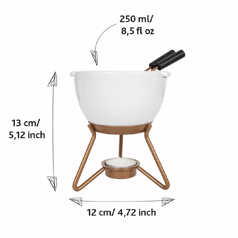 Choco Fondue Petitで最高のチョコレートフォンデュを制限なく楽しんでください。この完璧なフォンデュセットは、バン・マリー法(湯煎法)を使用します。溶けたチョコレートは焦げず、苦くならず、何時間でも温かく保たれます。セラミック製のフォンデュポットは250 mlの容量があり、美味しいチョコレートフォンデュを200グラム分楽しむのに十分です。