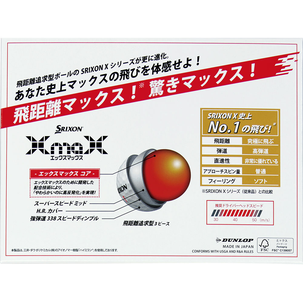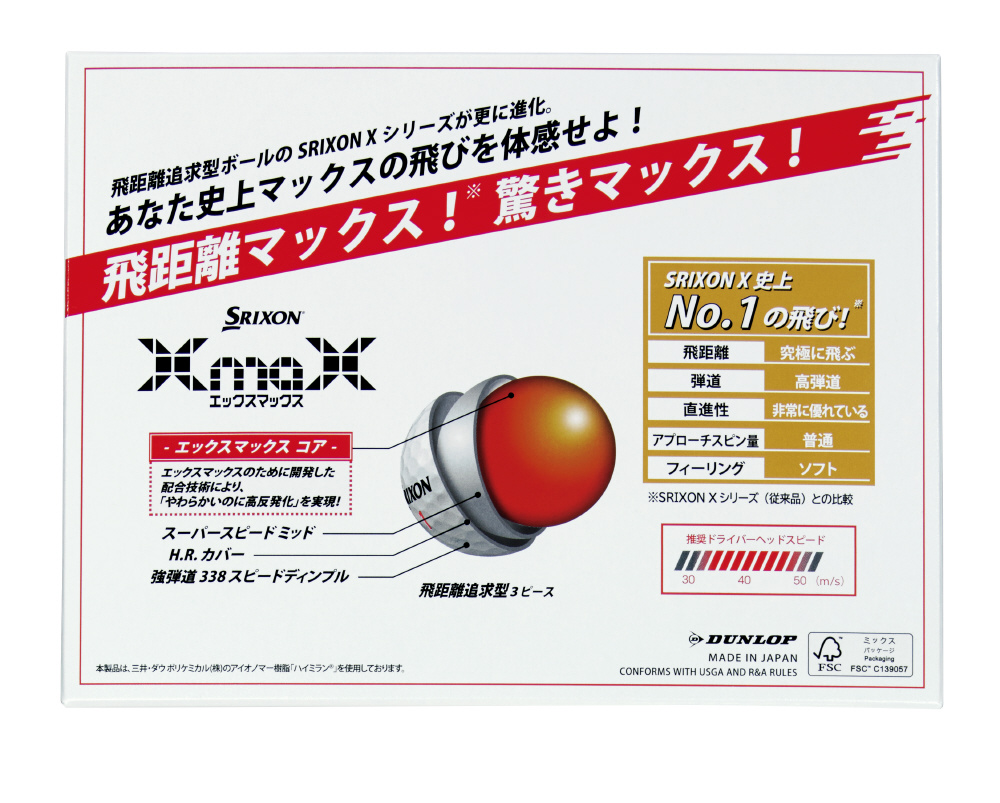 仕様1 FSC認証:本製品「スリクソン XmaX」のゴルフボールパッケージ及び梱包材の段ボールには、FSC認証紙を採用しています。