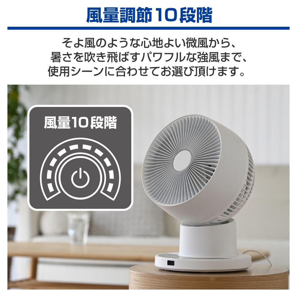 風量調節10段階。そよ風のような心地よい微風から、暑さを吹き飛ばすパワフルな強風まで、使用シーンに合わせてお選び頂けます。