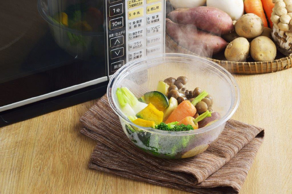 ガラスのように透明度が高く、中身が分かりやすい電子レンジ対応ボウル。