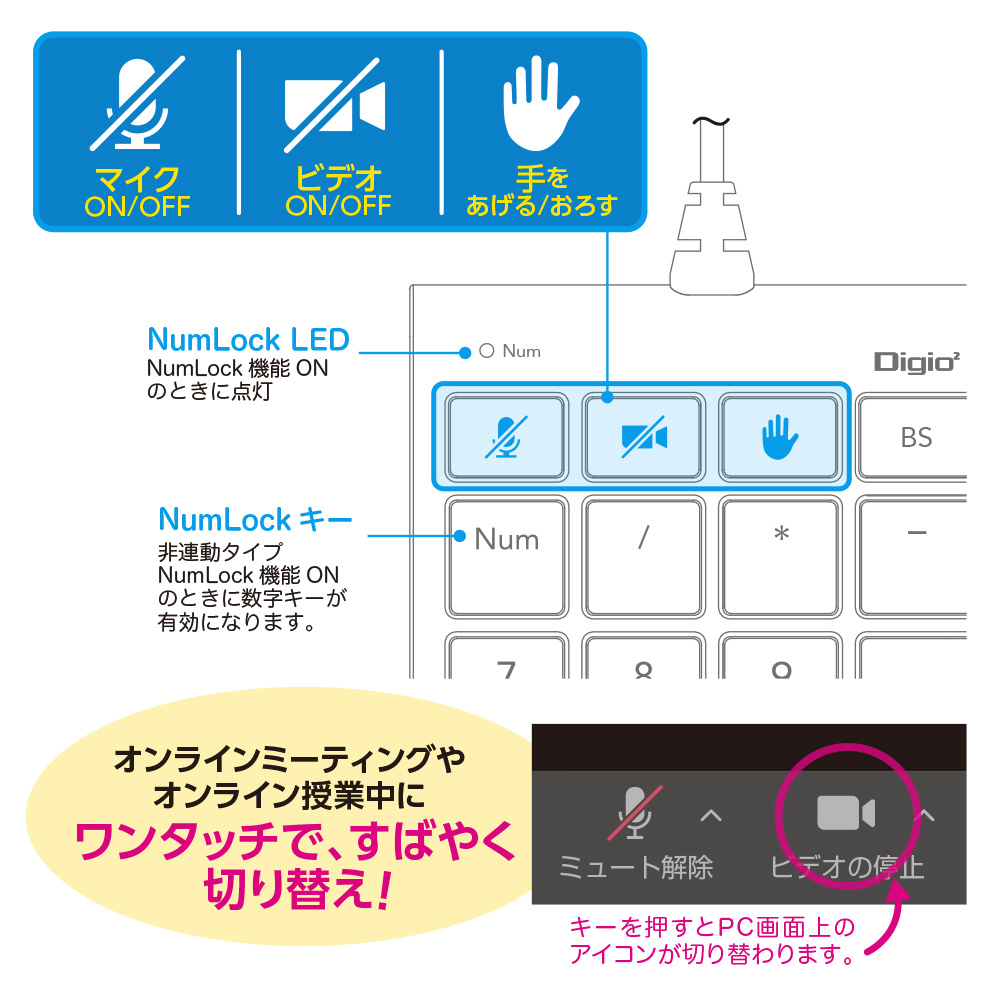 ■Zoom対応の割り当てキー(マイク・ビデオ・挙手)を搭載。