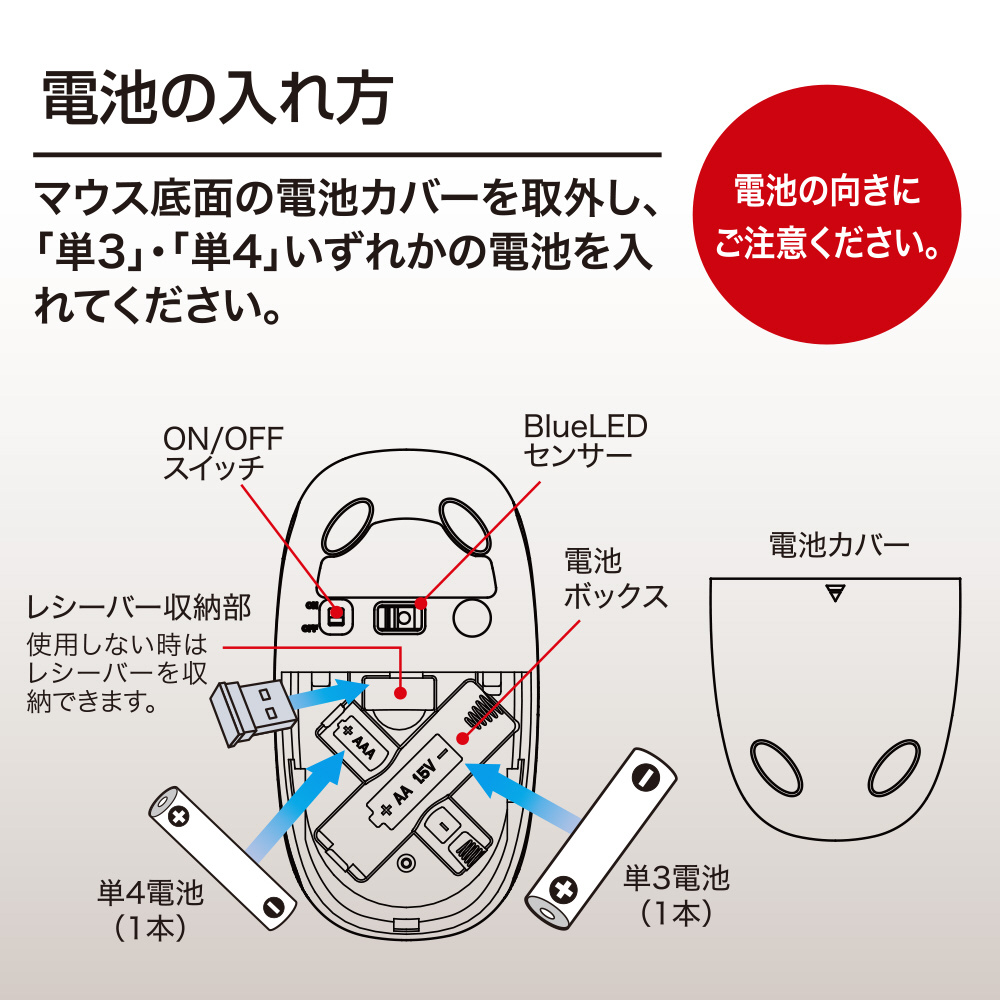 [使用電源]単3電池1本もしくは単4電池1本(マウス本体側)
