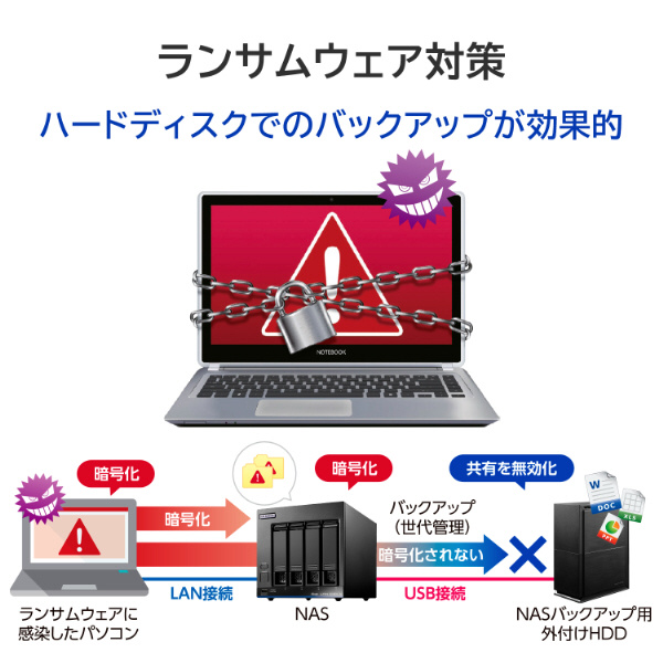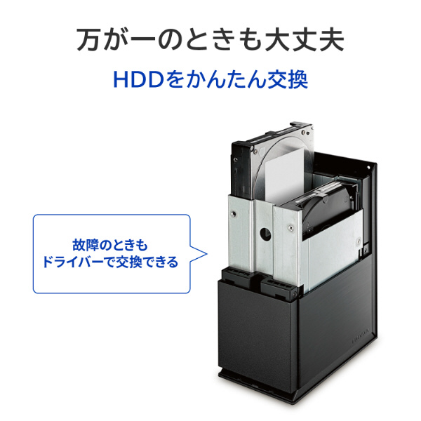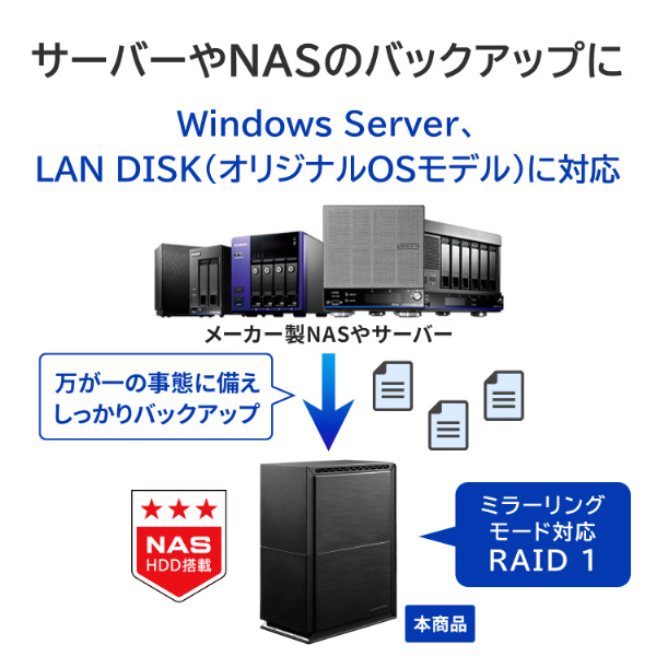 パソコンのデータ保存はもちろん、データ消失リスクを低減する『RAID 1(ミラーリングモード)』やアイ・オー独自の冗長性技術『拡張ボリューム』に対応しているため、バックアップ用にも最適です。