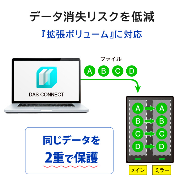※RAIDeX(拡張ボリューム)のご利用には、無償アプリ「DAS CONNECT」のインストールが必要です。また、実効容量は全体容量の半分となります。