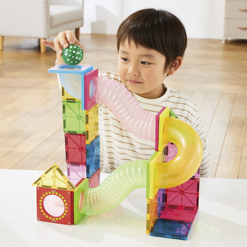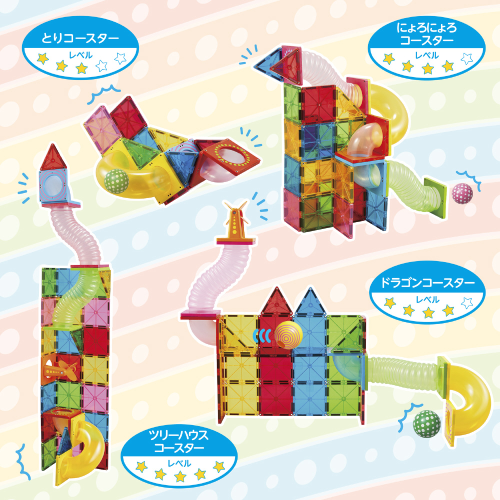 ボールが曲がったり勢いよく転がるダイナミックなコースターがつくれるセットです。
