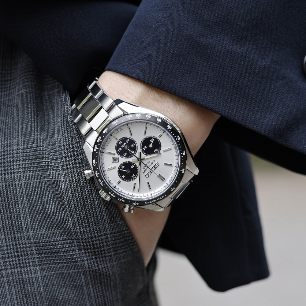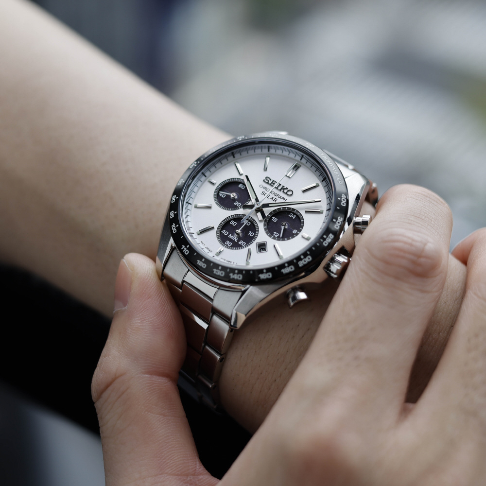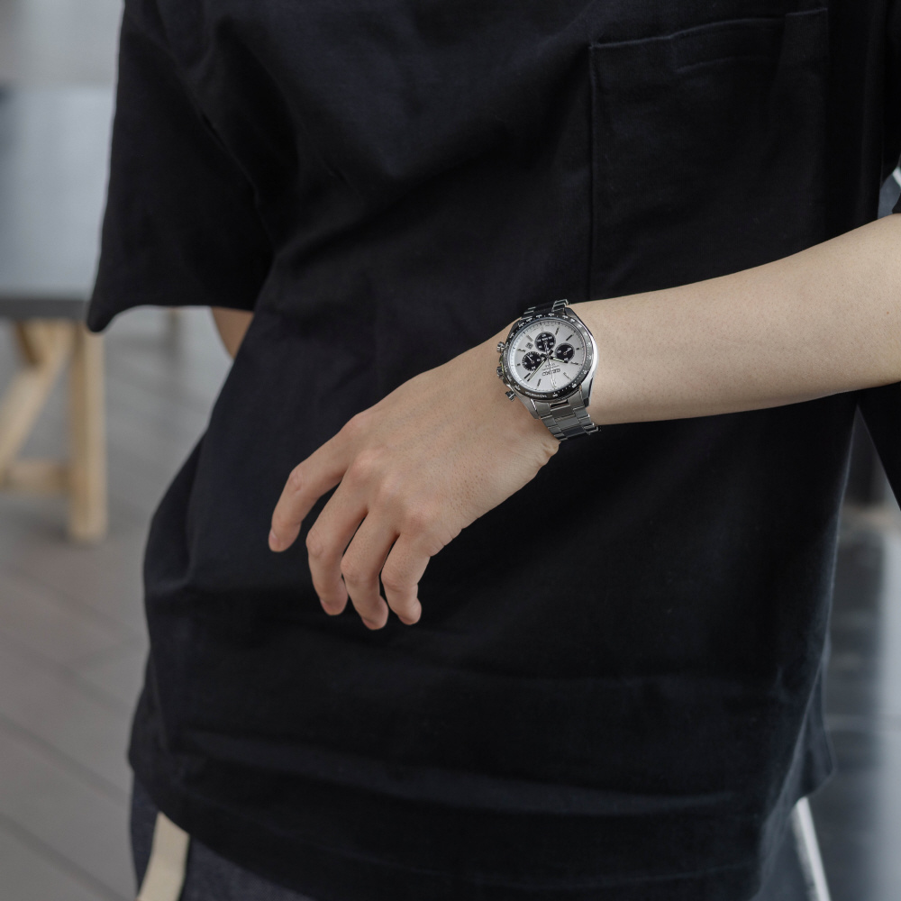 ■ 広めのダイヤルに、夜間でも時刻が分かりやすいルミブライトつきの、視認性に優れたソーラー クロノグラフモデル。ケースの側面やかん足部分に段差や面を付けた事で、傾けたときにキラリと光り上質感を演出。