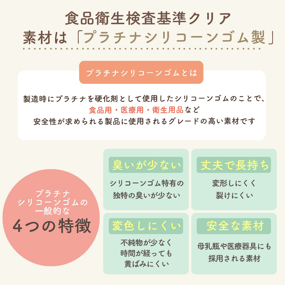 プラチナシリコーンゴムを使用しているため、シリコン特有の臭いが少ないのも特長です。