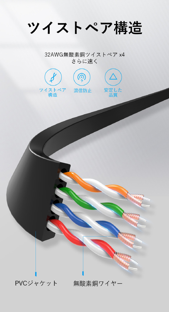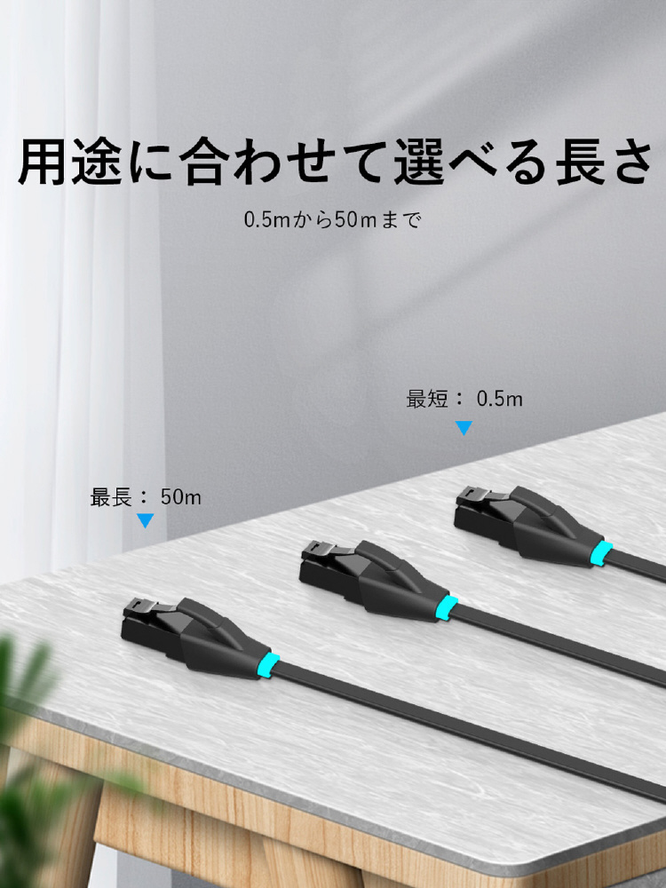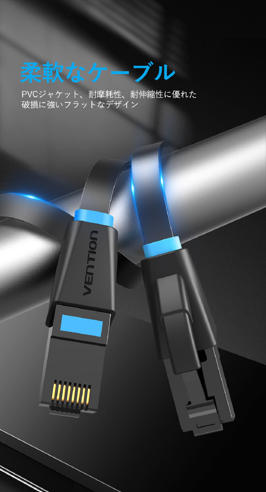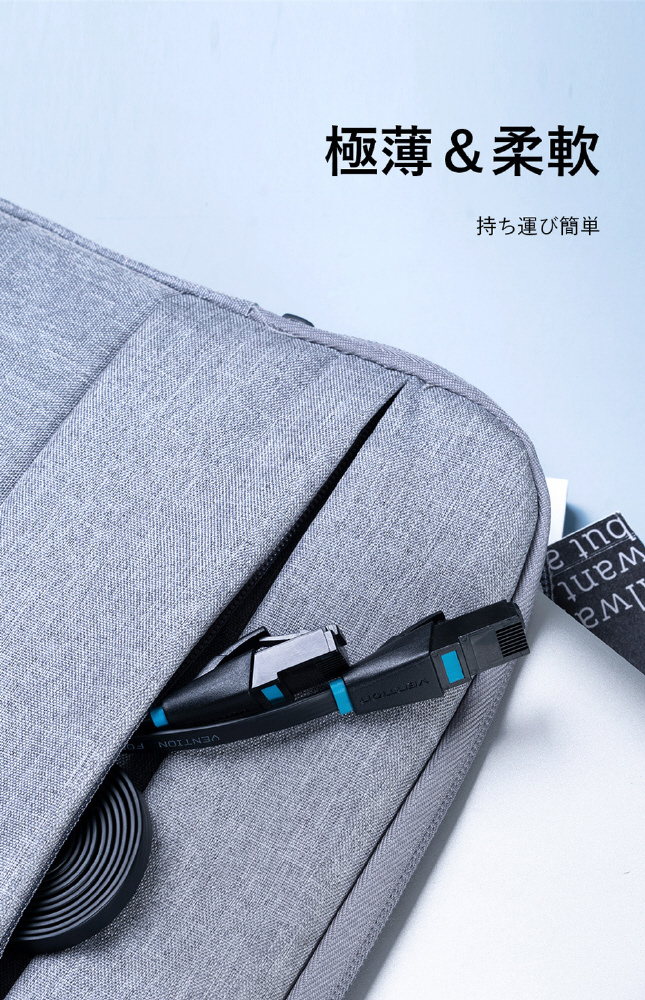 ■PVCジャケット、耐摩耗性、耐伸縮性に優れた破損に強いフラットなデザインで柔軟なケーブルです。