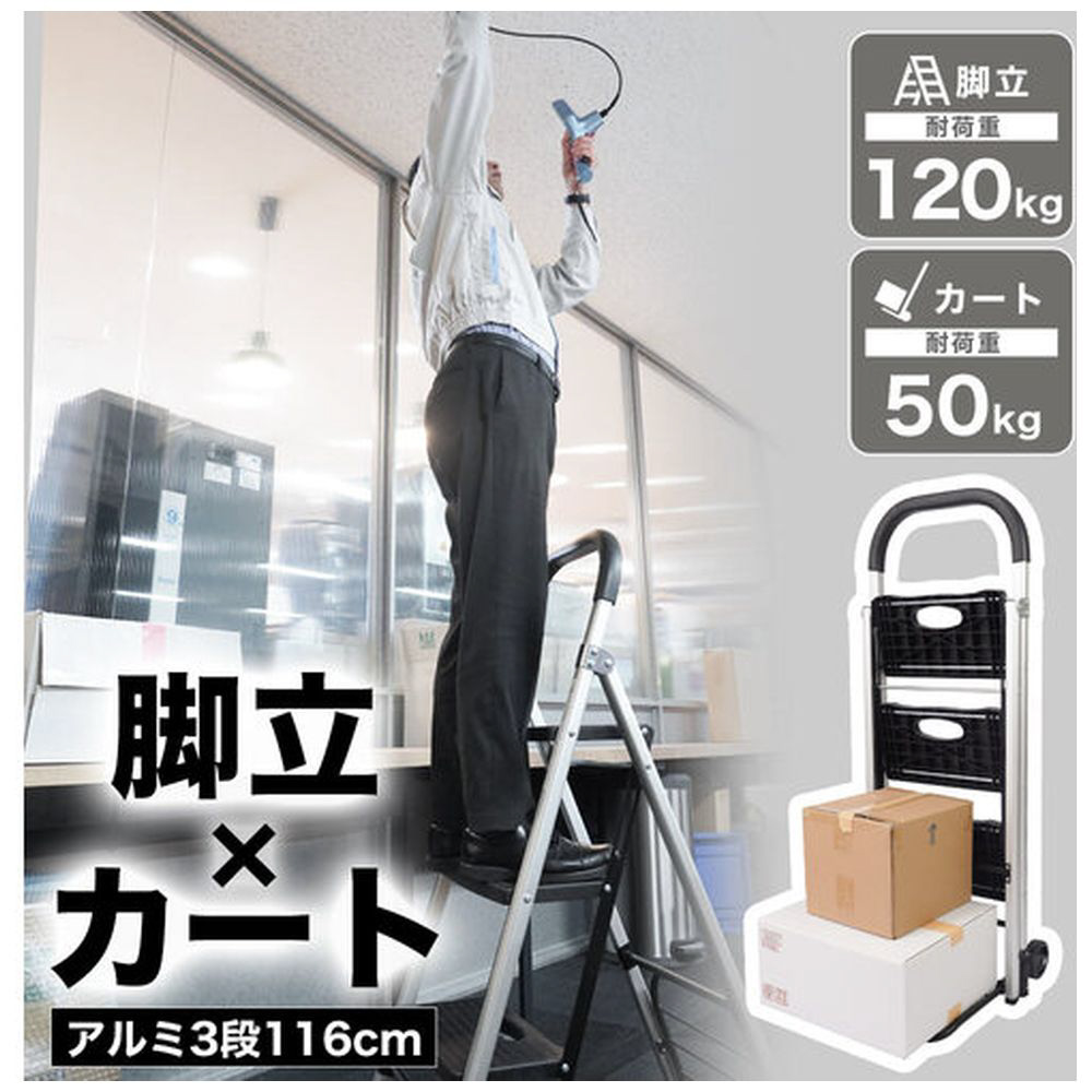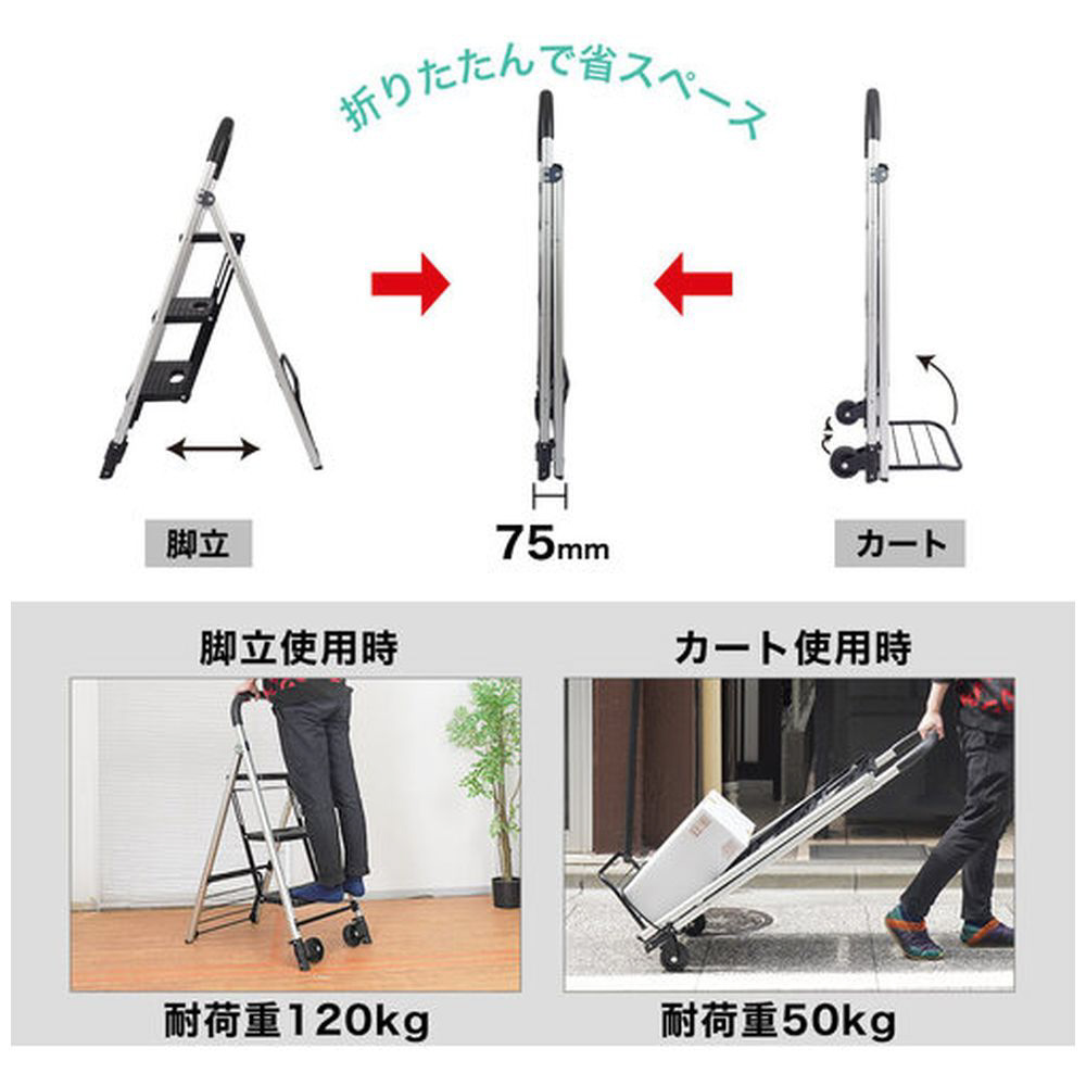 カートとして使用する場合の最大積載量50kg、脚立・踏み台として使用する場合の耐荷重は120kgとなります。