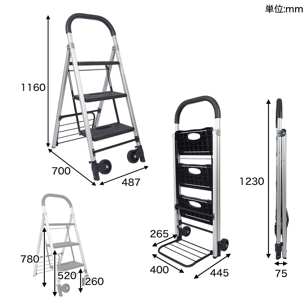 エアコンの掃除や電球の交換、洗車時などに便利な脚立と、物を運ぶのに便利なカートが合体しました。