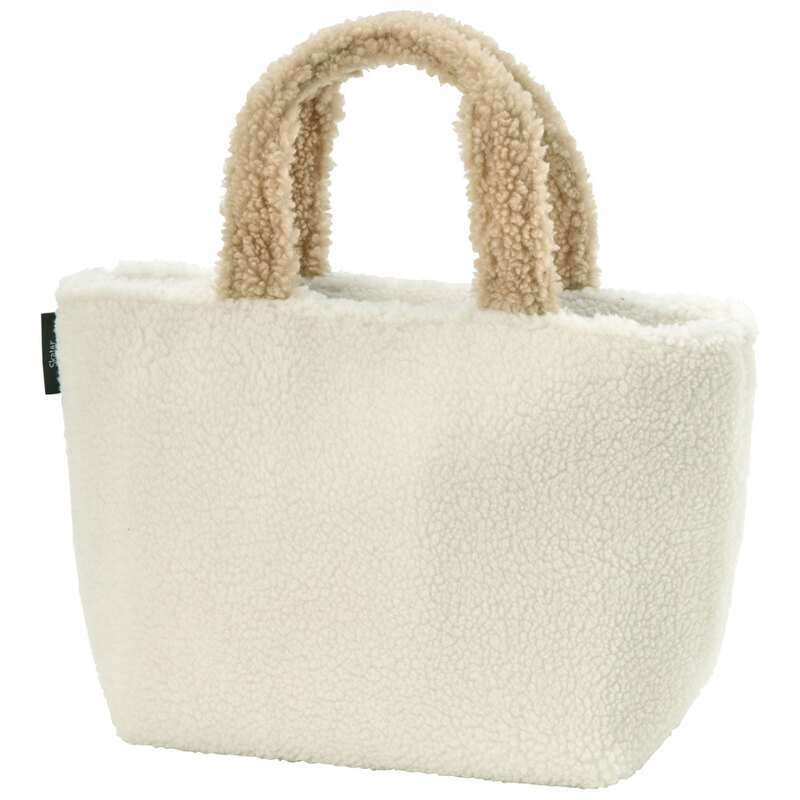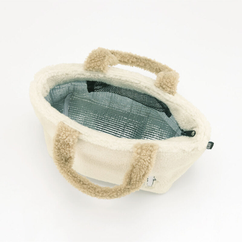 ボア生地のランチバッグで内側は保温、保冷効果のあるアルミ蒸着素材。保冷剤などを入れられるメッシュポケット付き。※洗濯はお避けください。汚れた場合は水またはぬるま湯で薄めた中性洗剤を柔らかい布に含ませ、汚れをふき取って下さい。※防水加工されておりませんので、バッグ内に溜まった水分が染み出てくる場合があります。