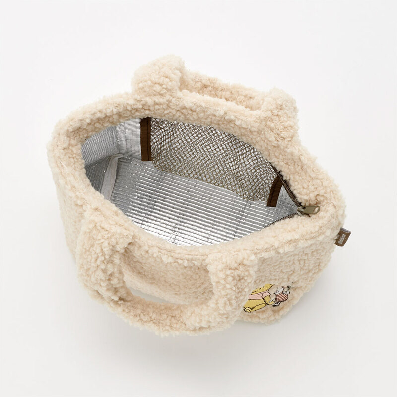 ボア生地のランチバッグで内側は保温、保冷効果のあるアルミ蒸着素材。保冷剤などを入れられるメッシュポケット付き。※洗濯はお避けください。汚れた場合は水またはぬるま湯で薄めた中性洗剤を柔らかい布に含ませ、汚れをふき取って下さい。※防水加工されておりませんので、バッグ内に溜まった水分が染み出てくる場合があります。