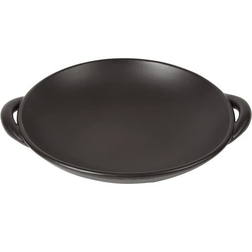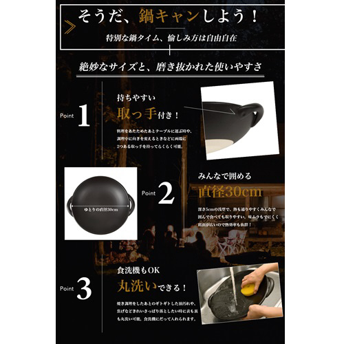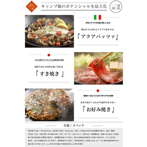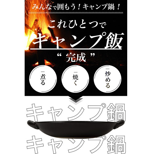 直径30cm(取手含まず)なので、仲間とでも、ソロキャンでも使えるちょうどいい大きさ。牛脂を使えば焼肉もできちゃう。色も黒なので焦げも目立ちにくく、セラミックのメリットとして金属のヘラも気にせず使える。従来品の悩みでよくあるダッチオーブンでは重い。スキレットでは小さい寸胴鍋では深すぎる。フッ素加工は扱いが大変。食洗機で洗いたい、そんなキャンパーにドストライクな『キャンプ鍋』。今、大人気です。