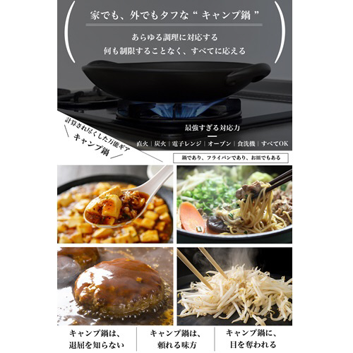 焼く・煮る・炒める・食べる! 盛り付ける手間も、洗い物の手間も省こう!キャンプ場へはあれもこれも持っていく必要なし。 これ1つで大自然の中でキャンプ飯作りとおいしいキャンプ飯が楽しめる。フライパンとしても使えるし、鍋にもなるので鍋キャンも楽しめる!キャンプ飯にキャンプ鍋、炒めものに、焼きもの、全部楽しもう。これを持っていくだけで、キャンプ飯制覇! 荷物も少なく、調理の負担も少なく 洗い物も少なく、楽しみは「盛りだくさん」に。