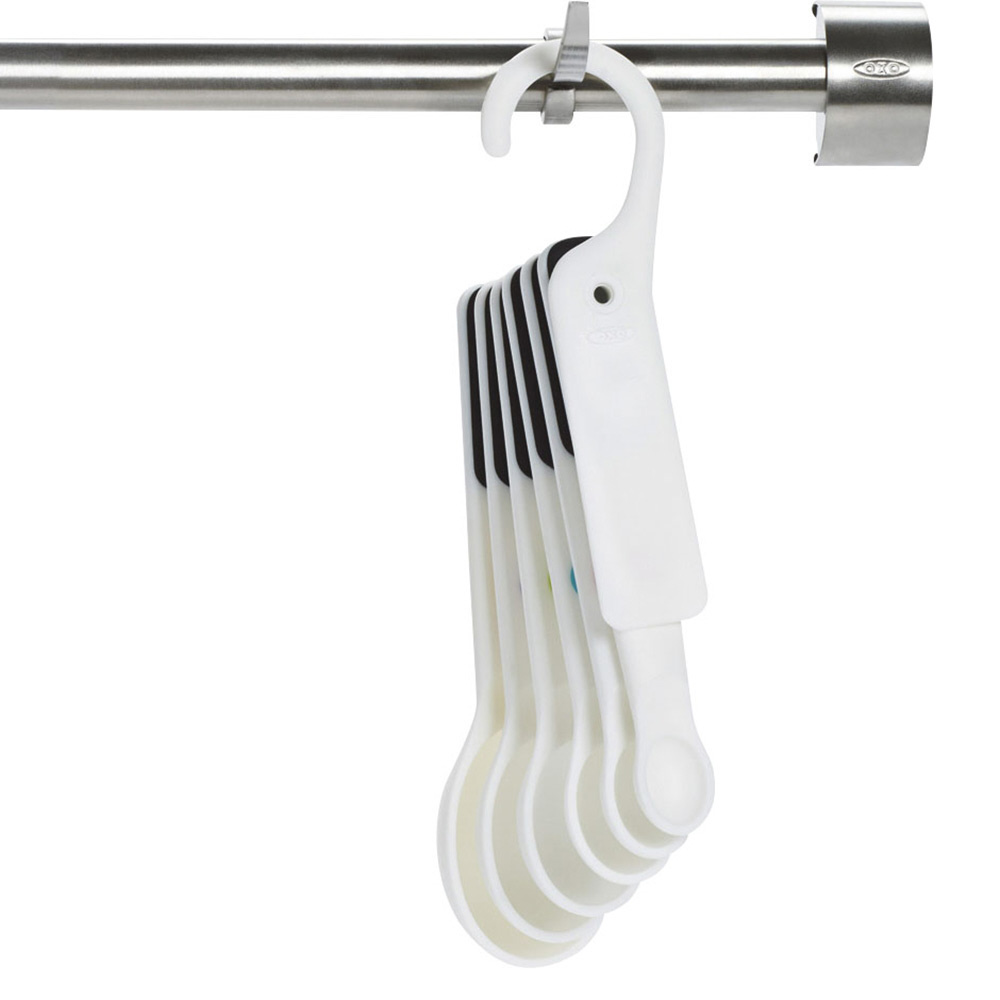 大さじ1、大さじ1/2、小さじ1、小さじ1/2、小さじ1/4、小さじ1/8、スクレーパ(兼フック)のセットです。