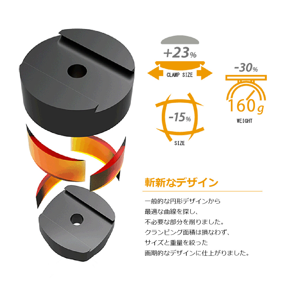 QR-65Pは、一般的な円形デザインから最適な曲線を探し、不必要な部分を削りました。クランピング面積は損なわず、サイズ: と重量を絞った画期的なデザインに仕上がりました。