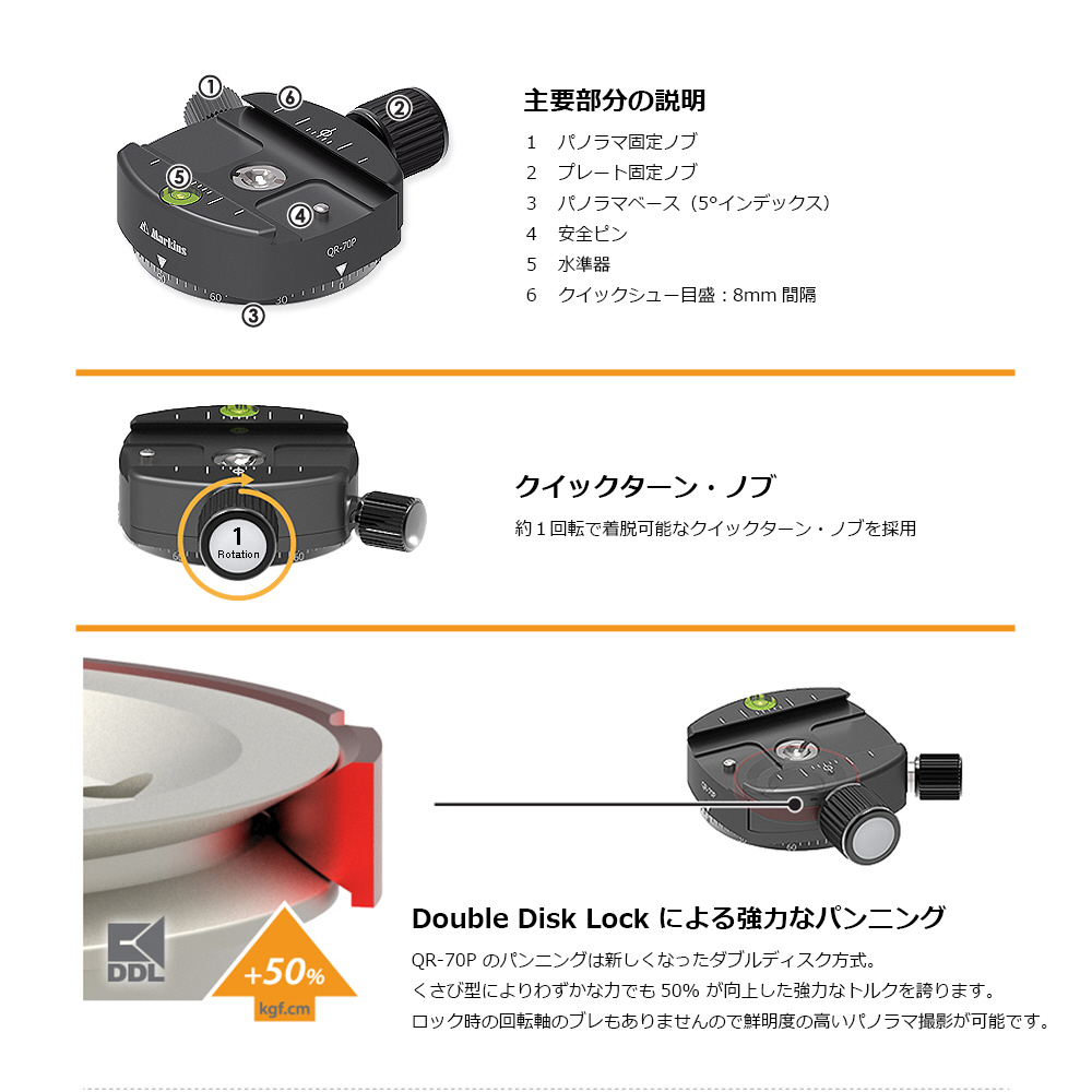 QR-65P のパンニングはダブルディスク方式。 わずかな力でも強力なトルクがかかるくさび型を採用しています。ロック時の回転軸のブレもありませんので鮮明度の高いパノラマ撮影が可能です。