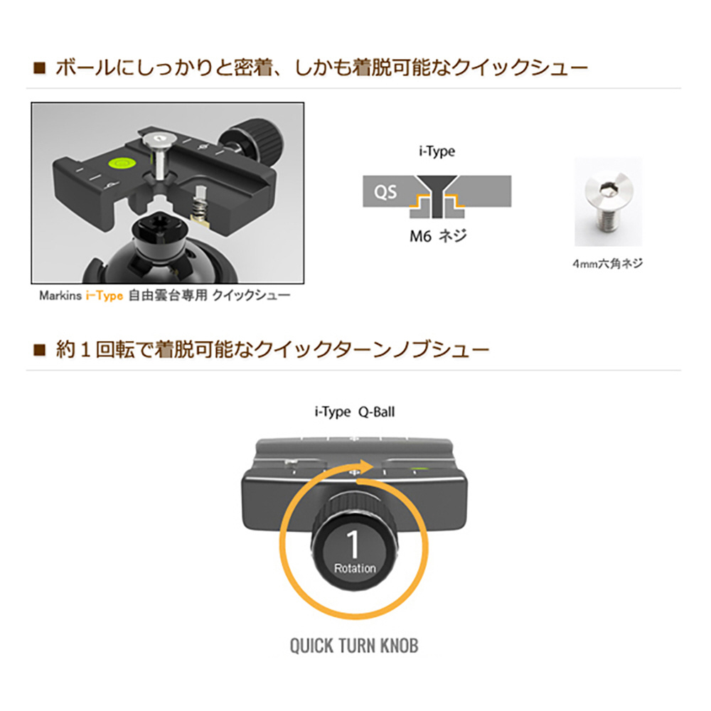 マーキンス(Markins)Q10iは、中判や超望遠レンズにおすすめのQ10iシリーズにノブ式クランプを装着したボール雲台です。