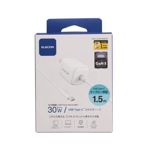 USB Type-C 充電器 PD PPS 30W Type C ケーブル 一体 1.5m 【 MacBook Air iPhone iPad Android スマホ タブレット その他機器対応 】 折りたたみプラグ ホワイト MPA-ACCP7930WH