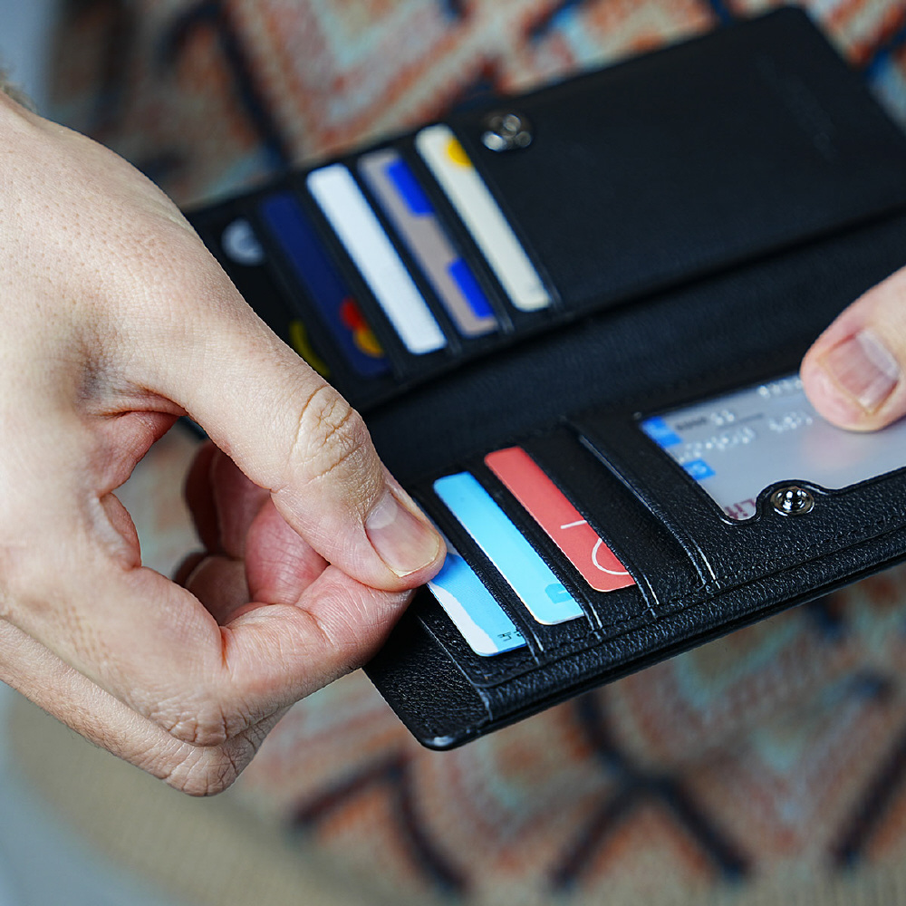 身分証明書用の透明スロットを含めた9つのカードポケットと、紙幣・領収書を収納できる4つのポケット、合計13個のポケットを備えています。