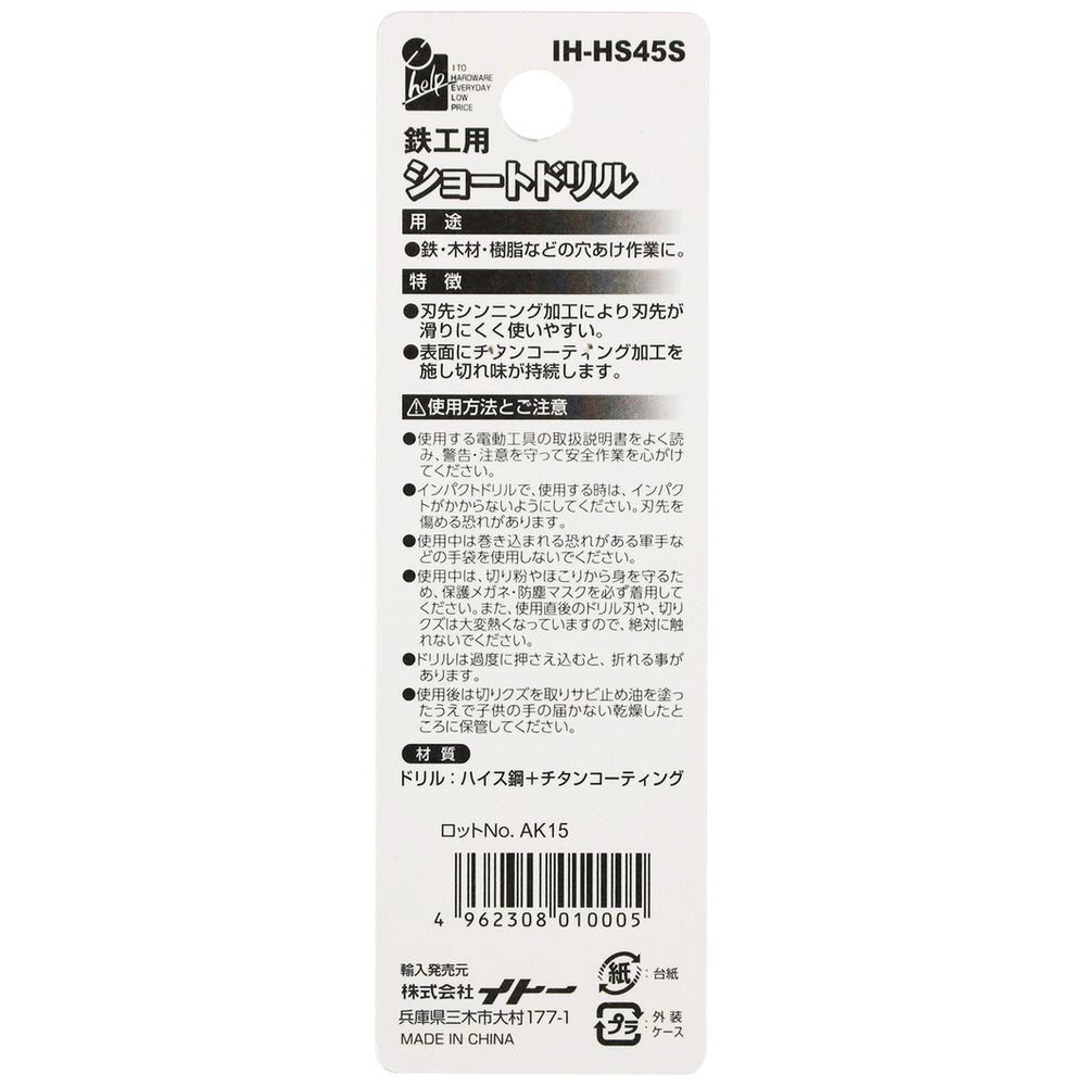 イトー #077671 ショートドリル鉄工用 4.5mm