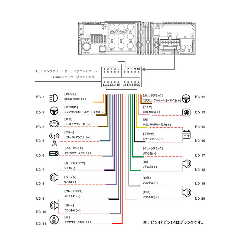 2つのRCAヘッドレストビデオ出力。工場/アフターマーケットアンプに接続するための4CHRCAオーディオ出力(2v)。個別のサブウーファー出力(0.8v)