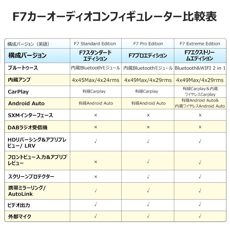 3つのビデオ入力で720PHDビデオ信号を処理できます:リバースカーカメラ入力、AUXオーディオ/ビデオ入力およびフロントカメラビデオ入力。 車のカメラ入力を逆にするために、指定されたATOTO HDリアビューカメラをF7G110XE-Aに接続して720Pビデオディスプレイを表示できます(他のほとんどのカーステレオブランドは、CVBS 480〜600ラインのビデオ信号のみを処理できます。)。F7 XEヘッドユニットの場合、指定されたバックミラーカメラはAC-HD02LR(別売り)です。 AC-HD03LRは互換性がありません
