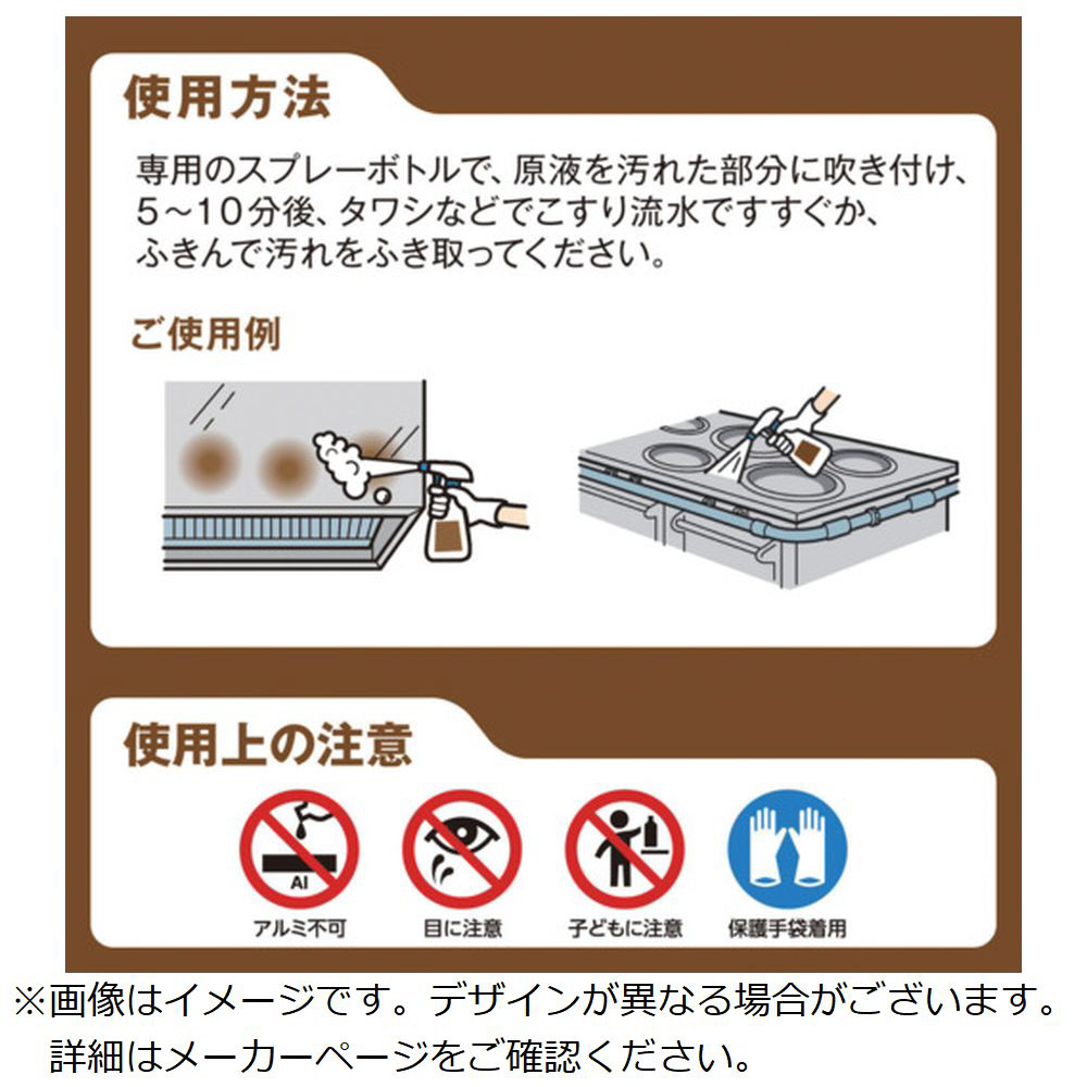 ・希釈倍率(倍): 原液を汚れの部分に直接吹き付ける。毎日洗浄する場合や汚れがひどくない場合は5倍に薄めて使用する。