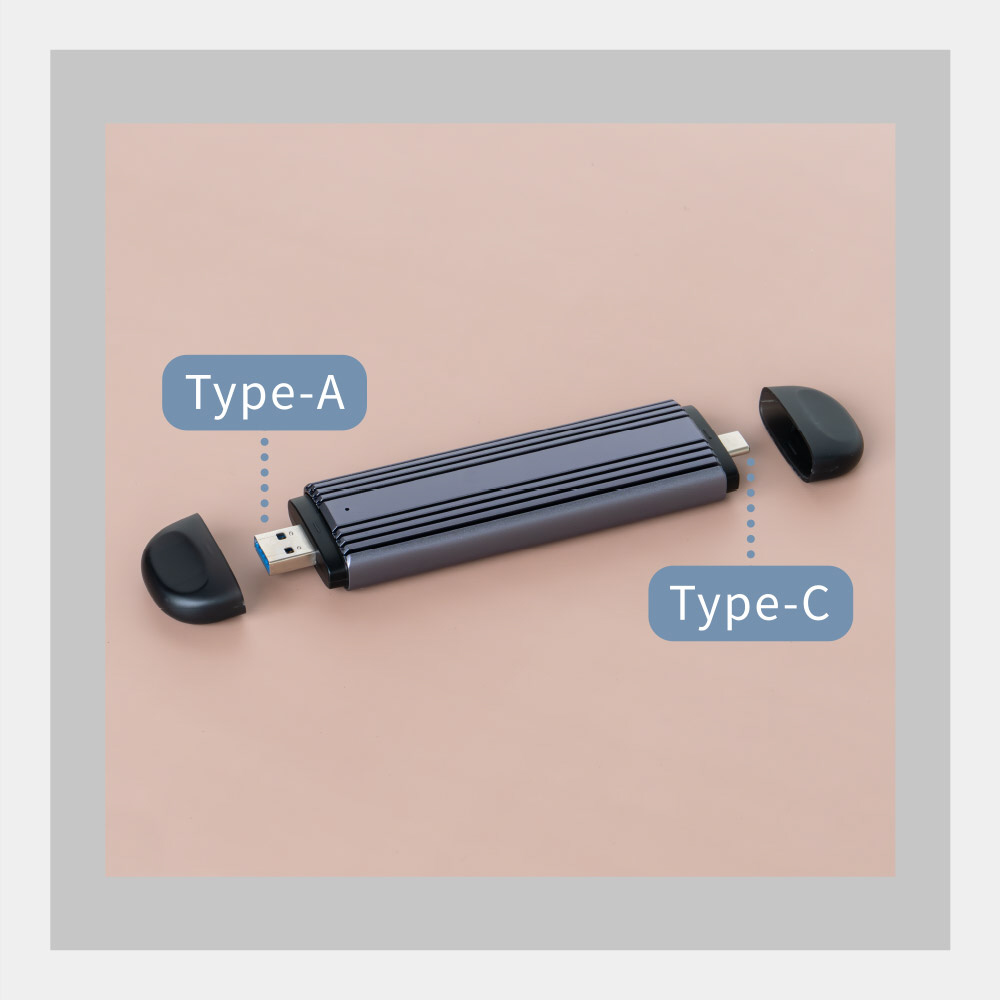 本製品はM.2 SSD用の外付けケースです。USB Type-AコネクターとUSB Type-Cコネクターが一体となっているため、ケーブル不要でお使いいただけます。