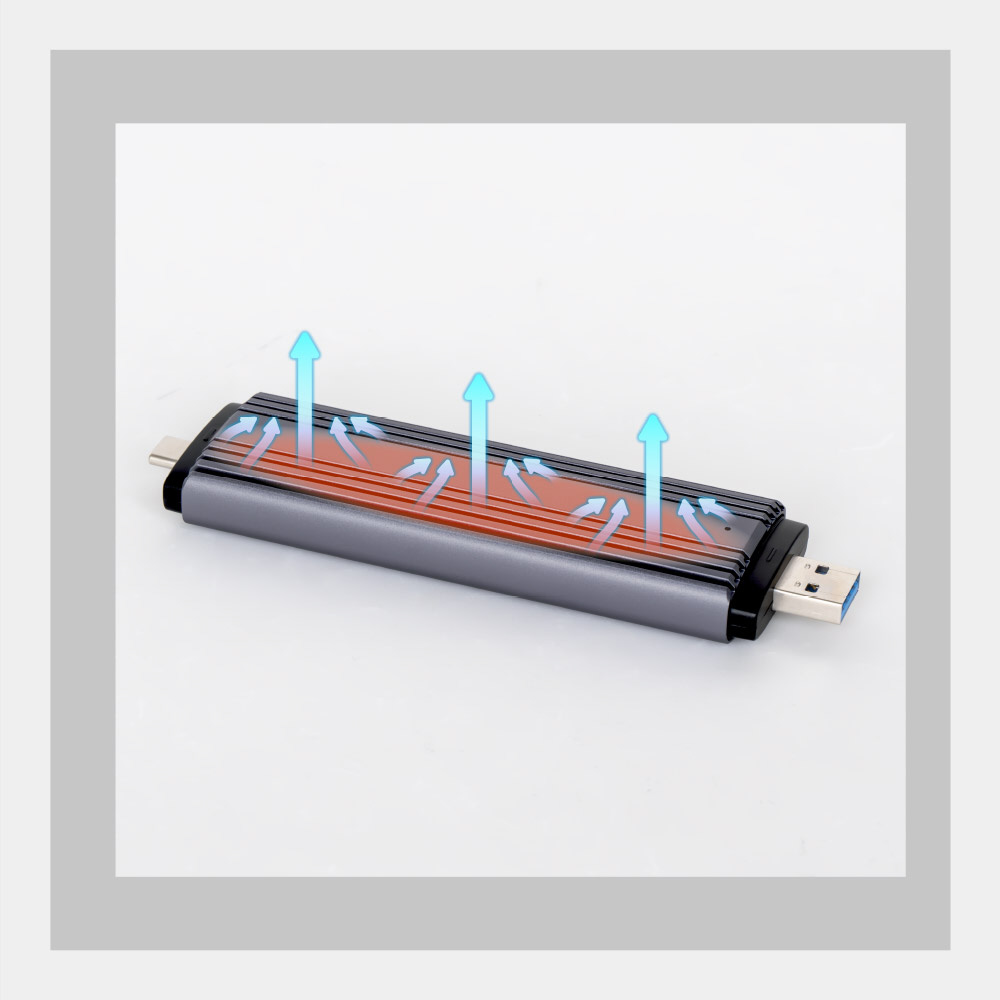 付属の熱伝導シートとヒートシンクでM.2 SSDの熱を効率よく吸収し、高放熱構造のアルミボディから放熱します。