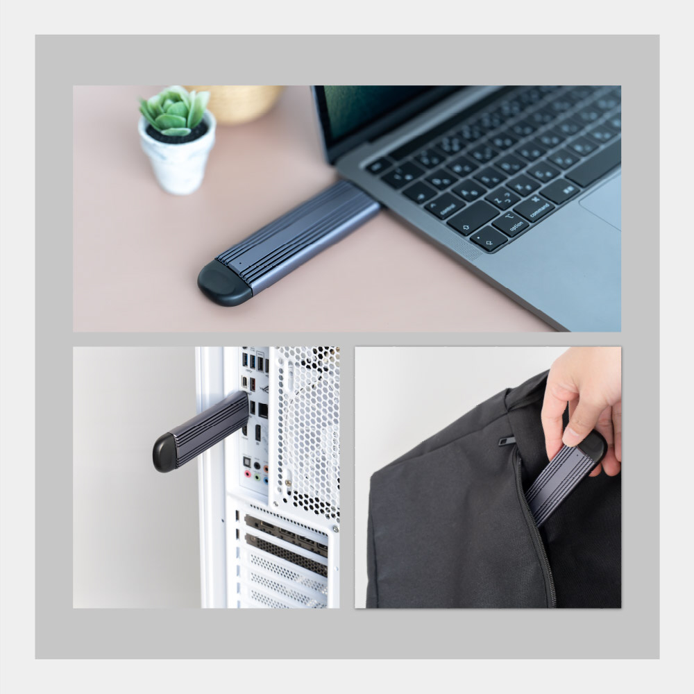 Type-AコネクターとType-Cコネクターの両方で最大10Gbpsの超高速データ転送が可能なため、M.2 SSDに保存した動画や画像の読み込みなどでも非常にスピーディーな作業を行うことができます。