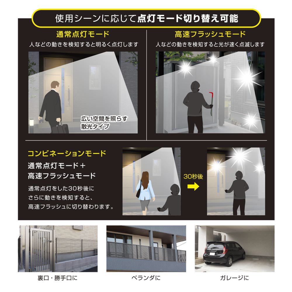 通常点灯モード…人などの動きを検知すると明るく点灯します(点灯時間は約5〜20秒に調節可能)<br>高速フラッシュモード…人などの動きを検知すると光が強く点滅します。