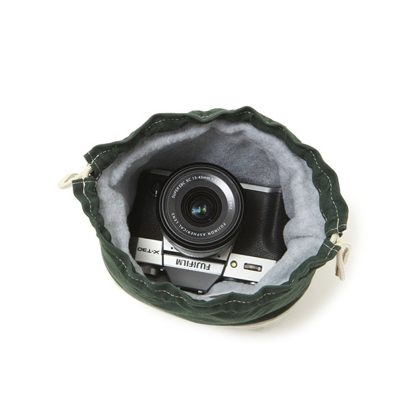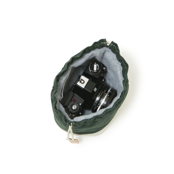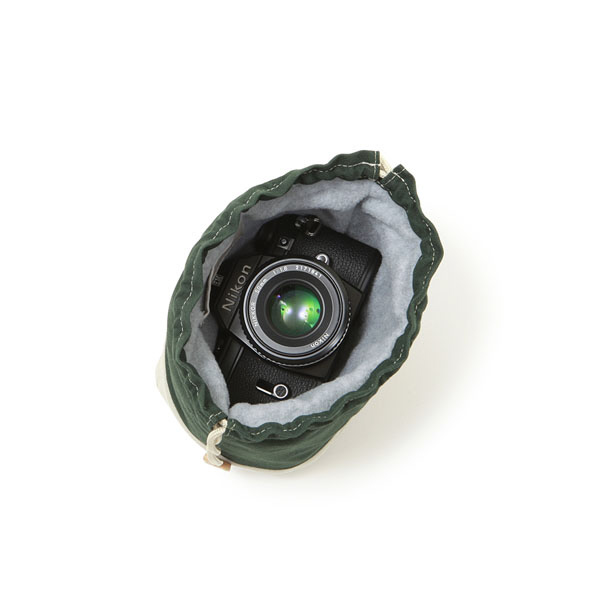 お好みのバッグに収納して持ち運べるカメラ用きんちゃく袋。小型のミラーレスカメラやフィルム一眼にぴったりの2つのサイズをご用意。