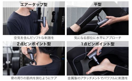 振動を当てたい部位と好みの感じ方に応じてアタッチメントを4種類から選べます。