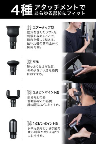 4種のアタッチメントであらゆる部位を効率よく刺激するリフレッシュガンです。