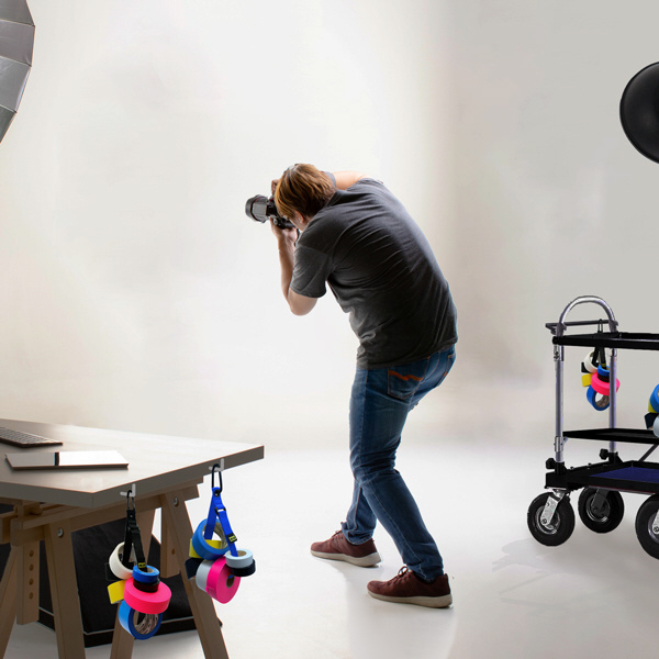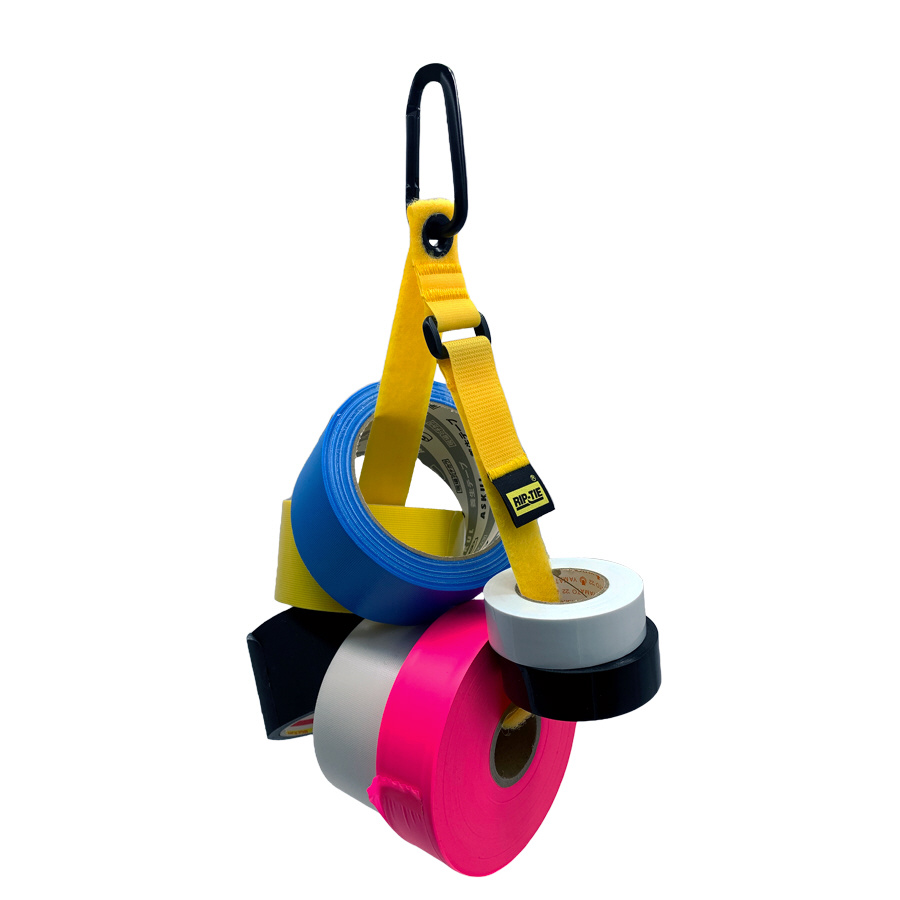 付属のカラビナでツールベルト、バッグ、ラック、機材運搬用カートなどに吊るして、テープ類を適切に管理します。テープ側面の汚れ防止にも◎