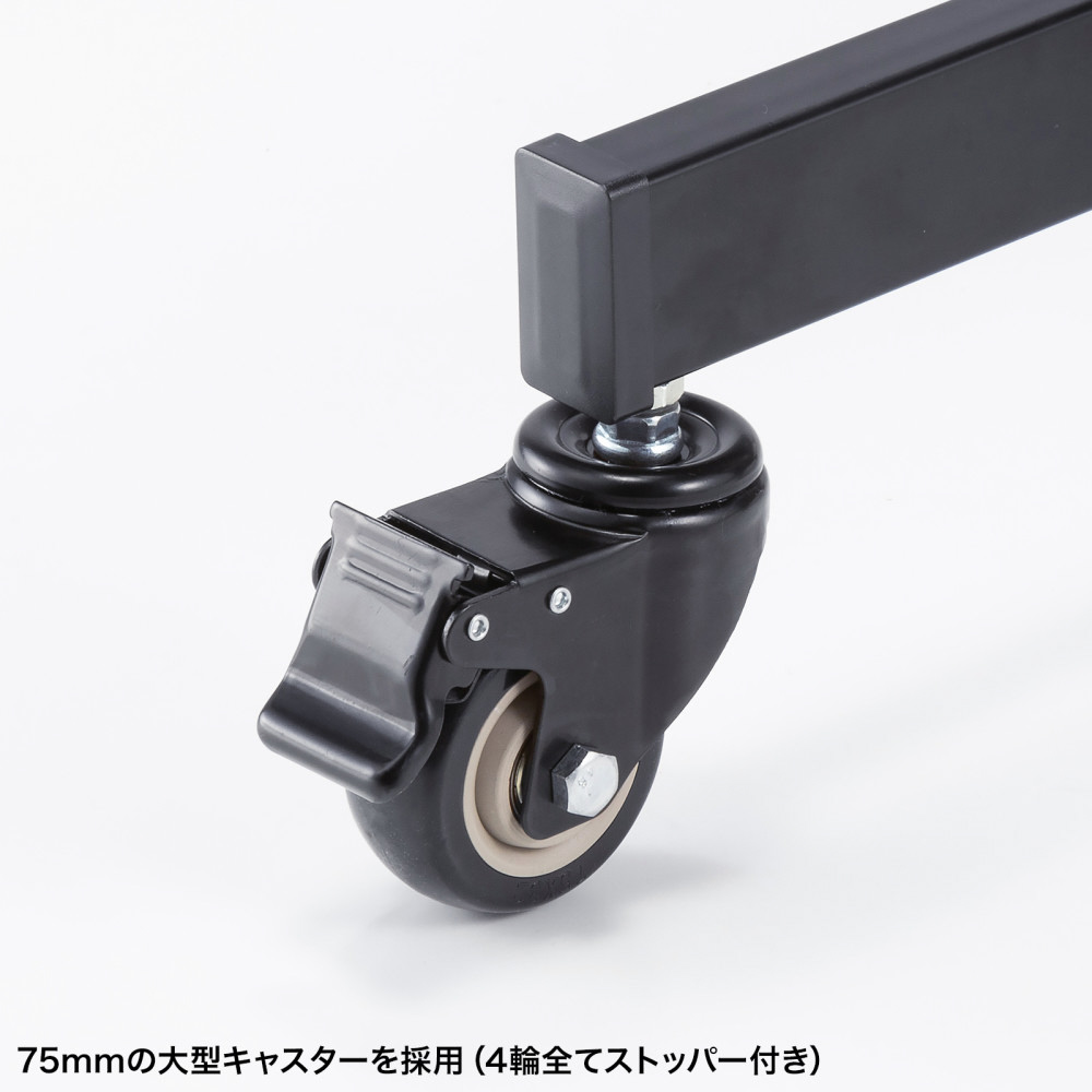 ●75mmの大型キャスターを採用しており移動も安心です。4輪全てストッパー付き。