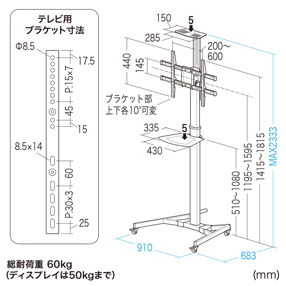 ●ブラケット中心位置を1415mm〜1815mmの間で無段階で可動します。