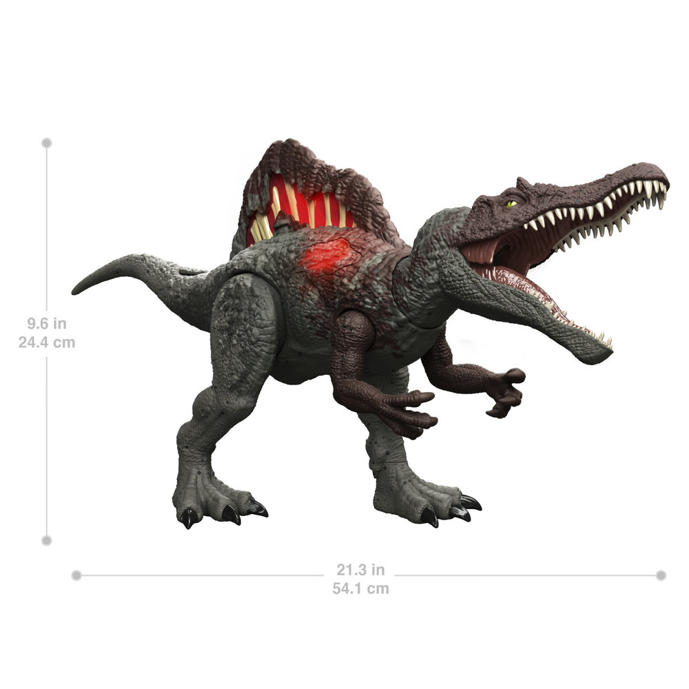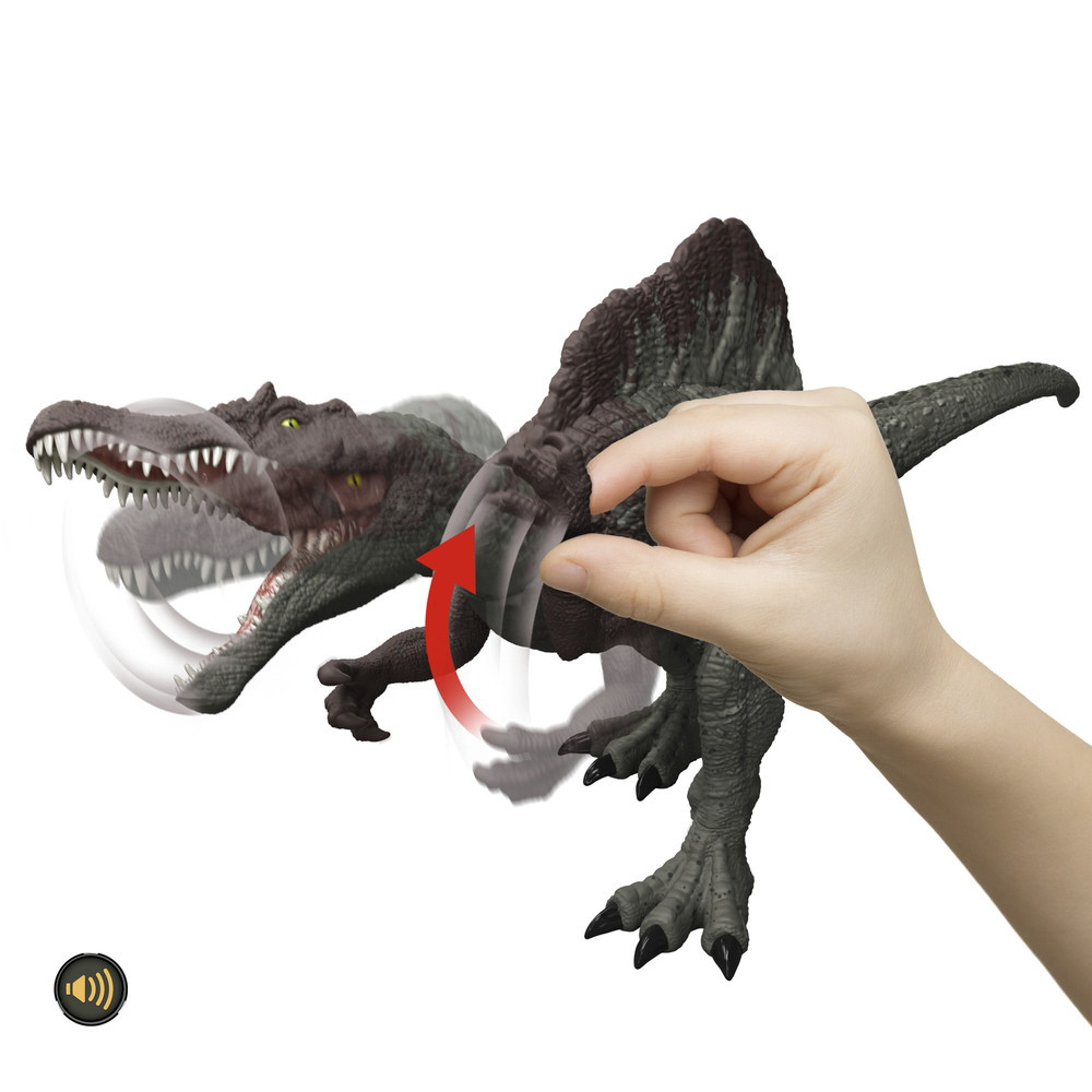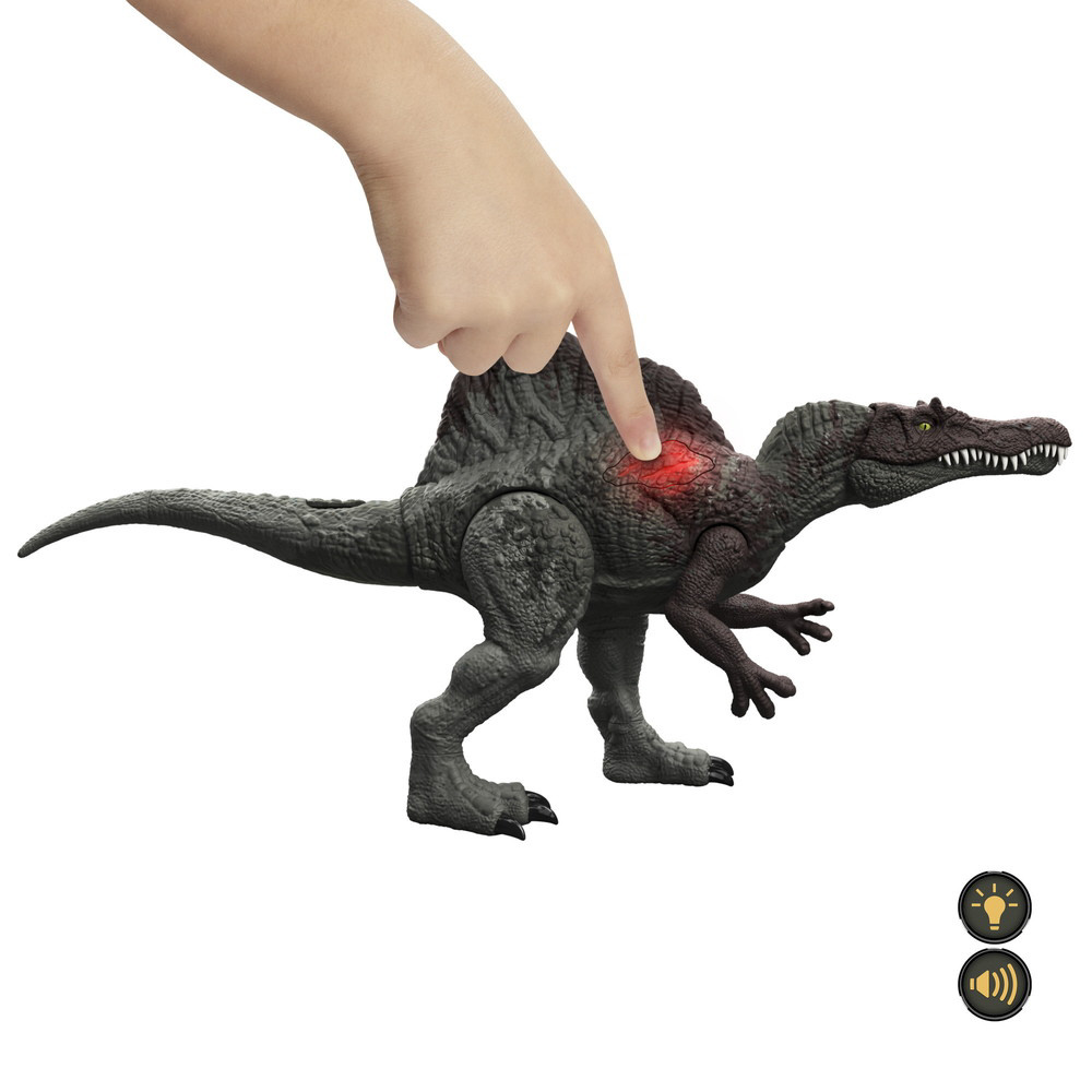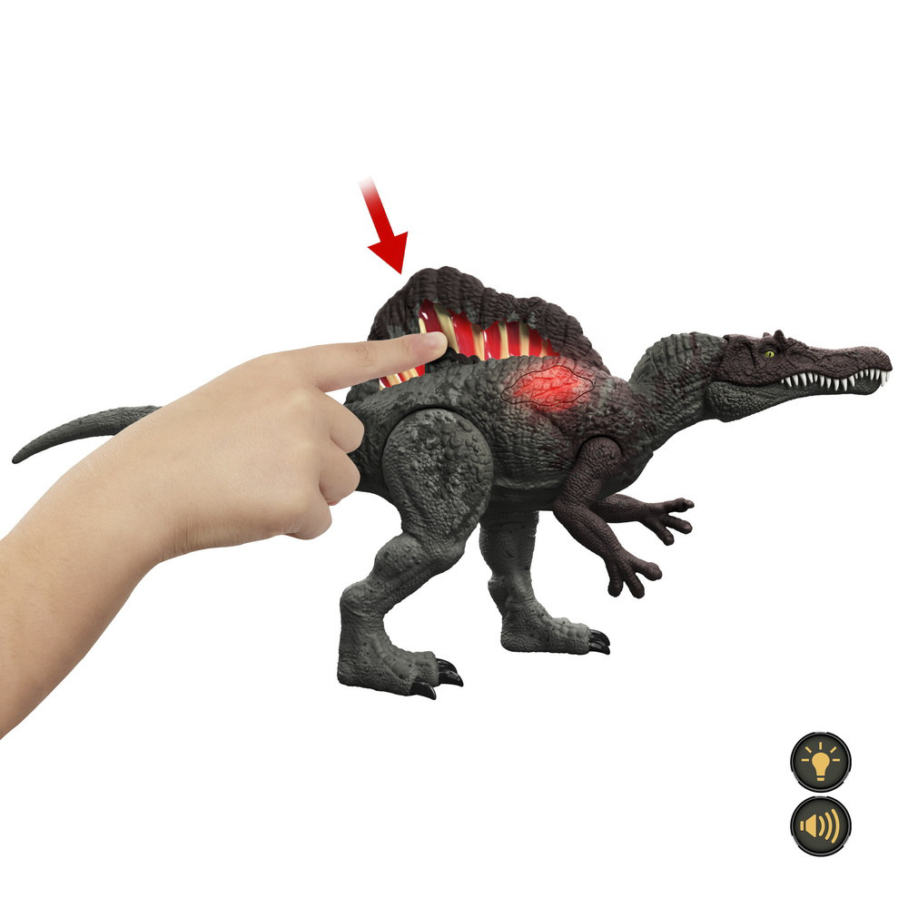 からだのボタンを押したりうでを持ち上げると、ダメージが光ってほえるスピノサウルスのフィギュア。