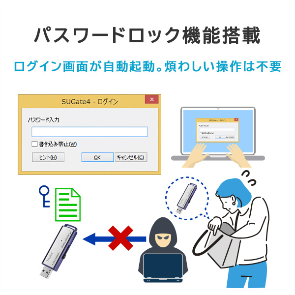 パスワードを入力してログインするまではデータ保存領域へアクセスできないため、盗難や紛失時にも内部データを読みとられるリスクを軽減させます。