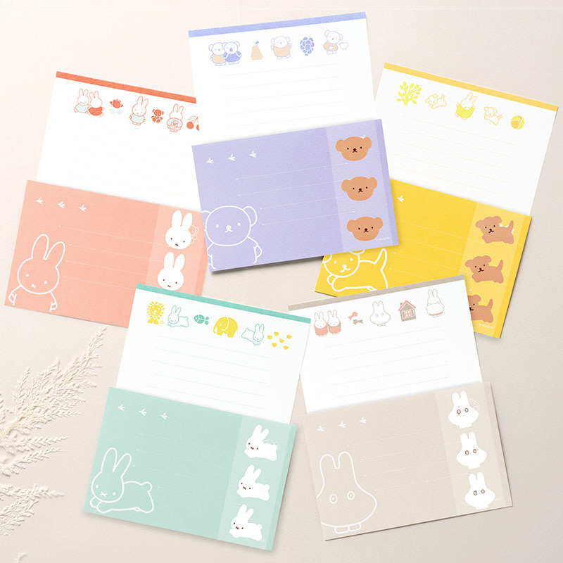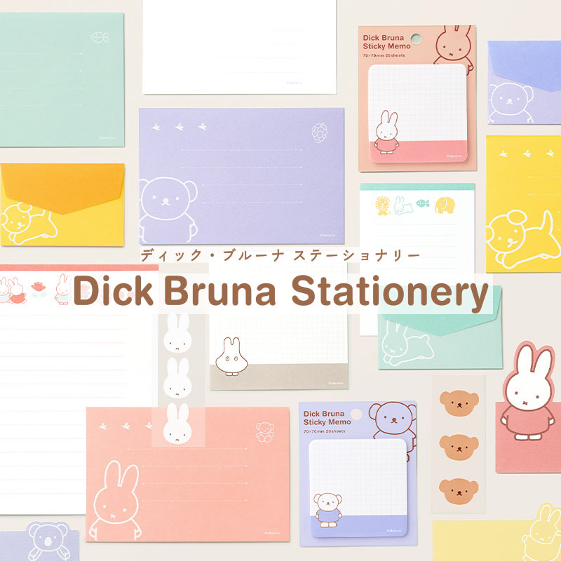 ディック・ブルーナの絵本のキャラクターをあしらったステーショナリーシリーズ。明るくやさしいカラーで大人も使いやすいデザインのレターセットです。キャラクターで選んでも、好きな色で選んでも。
