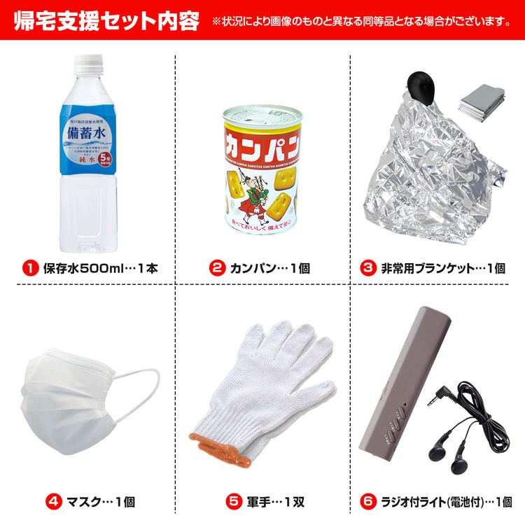 【セット内容】バッグ、保存水500ml、カンパン、非常用ブランケット、軍手、携帯FMラジオ&LEDライト(色指定不可)、マスク、単4電池×2
